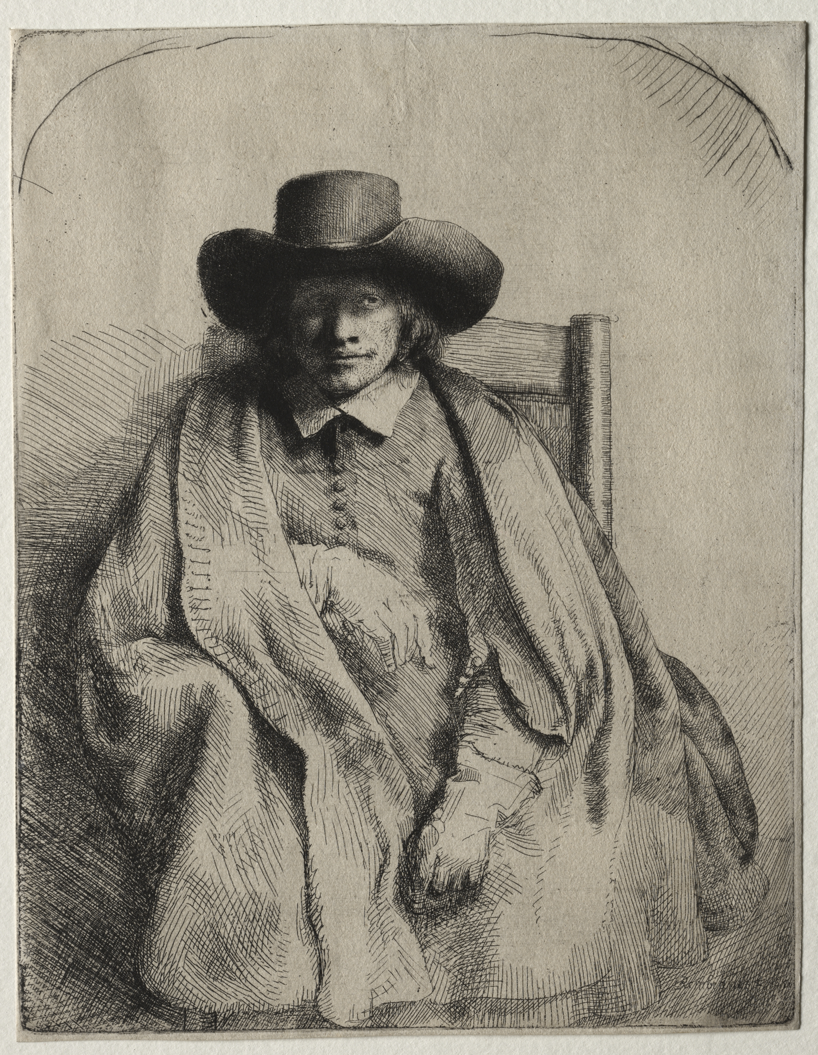 Black and white etching of a man sitting in a chair. The man is wearing a wide-brimmed hat, a collared shirt, a coat, and a cloak. He has both hands resting on his lap. The background includes short diagonal lines on the left side and a wooden chair on the right. A curved line borders the top. The print is titled "Clement de Jonghe, Printseller" and is by Rembrandt van Rijn.