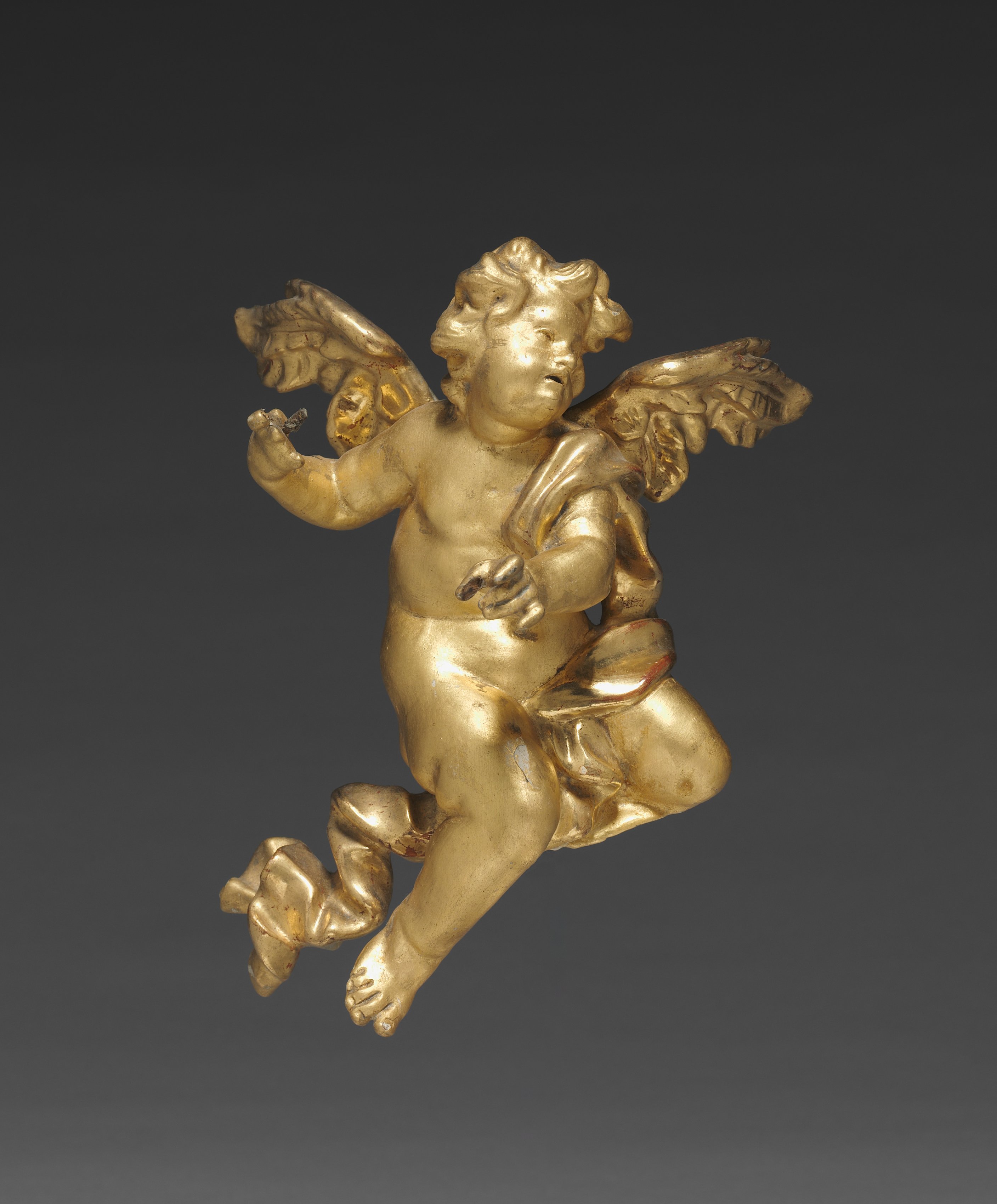 Golden statue of a cherub with wings, kneeling on right leg, left leg bent behind, with left arm across body and right arm raised, against a dark background.