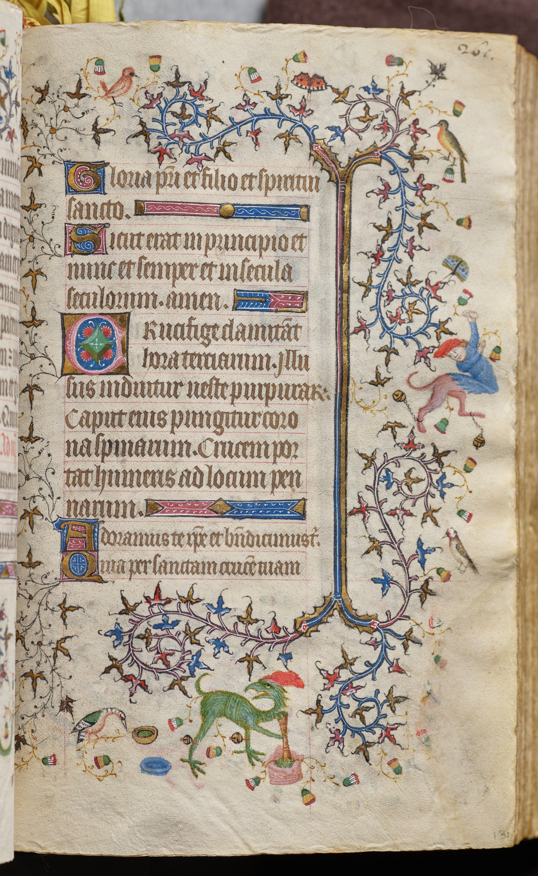 Illuminated manuscript page with text written in brown ink. Central column of text with gold initial. Decorative border of blue, gold, and pink vines with many birds, one large pink and blue figure on right. A green creature with long neck at bottom.