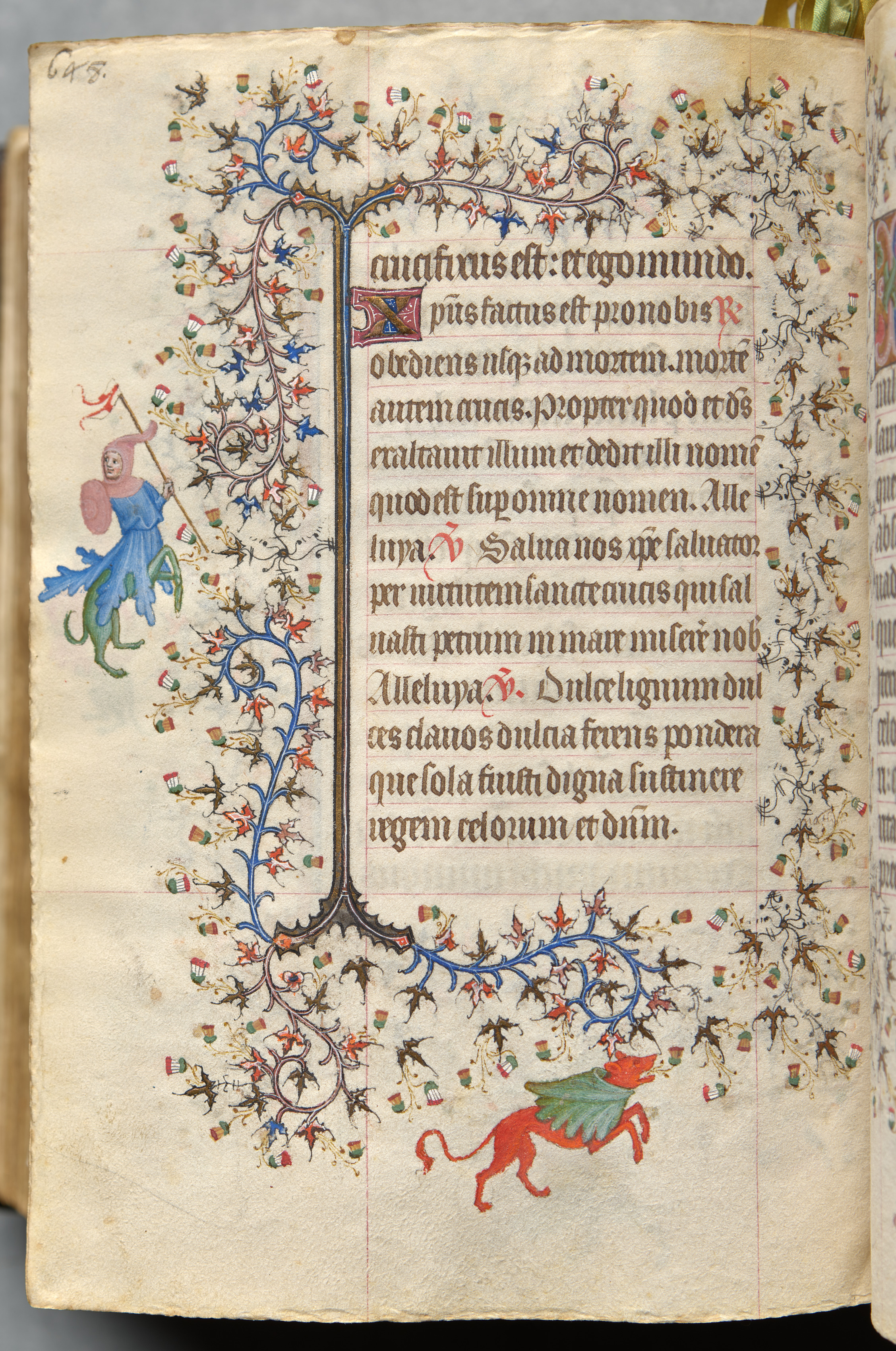 Illuminated manuscript page with text in black and red ink, surrounded by a decorative border featuring blue vines and colorful floral motifs. A red lion-like creature with a green wing on its back appears at the bottom. A man in a pink hat, blue and pink garment and green shoes holds a red flag with a white cross on the left.