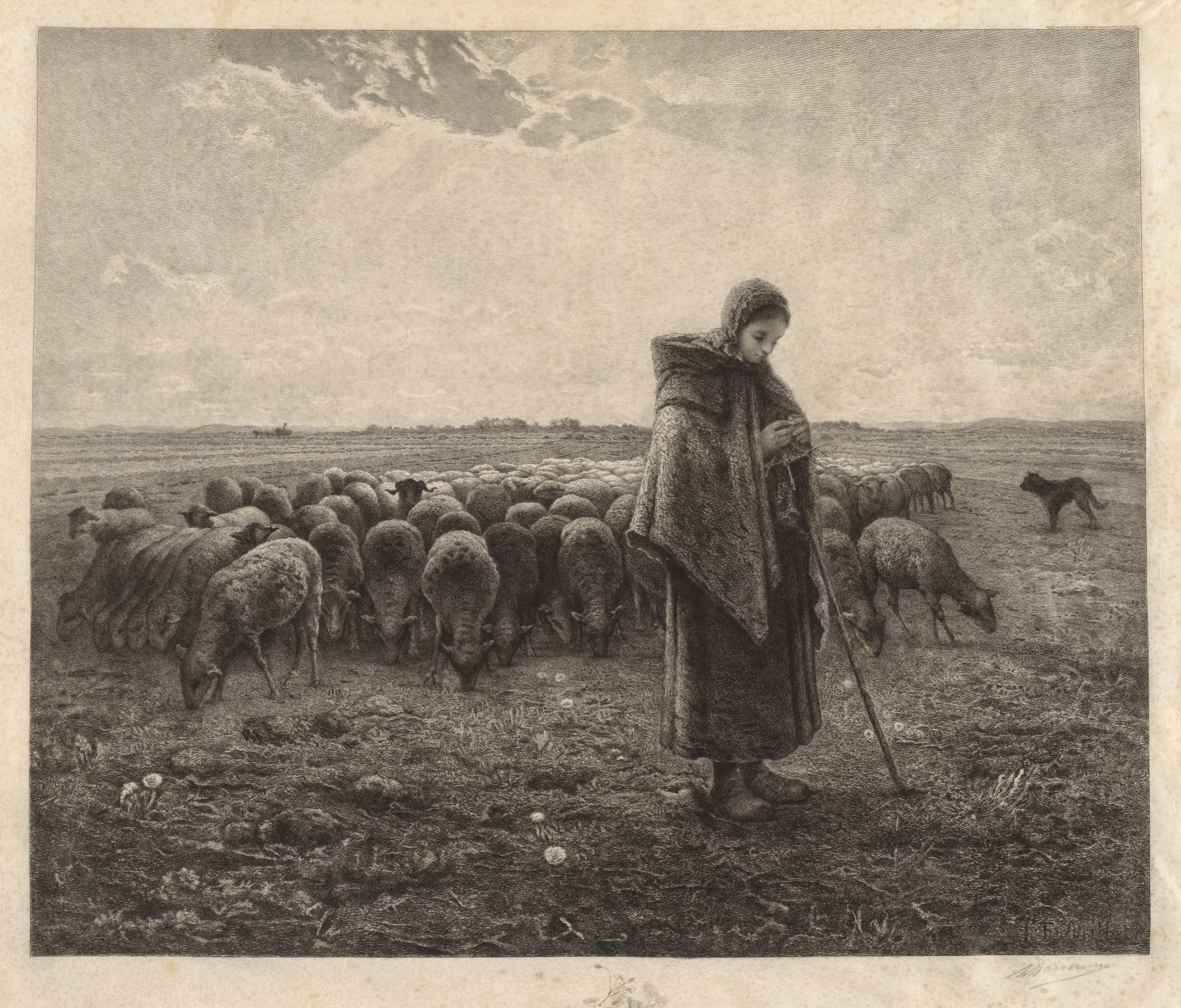 The image depicts a black-and-white drawing titled "La Bergerie" by Benjamin-Louis-Auguste Damman. The scene shows a woman standing in a field with a flock of sheep. The woman wears a long dress and a shawl over her head and shoulders, and holds a shepherd's staff in her right hand. She looks down at her chest. The flock of sheep grazes around her, with one lamb in the foreground and a dog standing behind the flock. In the background, a cloudy sky and a distant line of trees are visible. The drawing is rendered in a detailed, realistic style. The image has a light-brown border around the edges. The mood is serene and rustic.