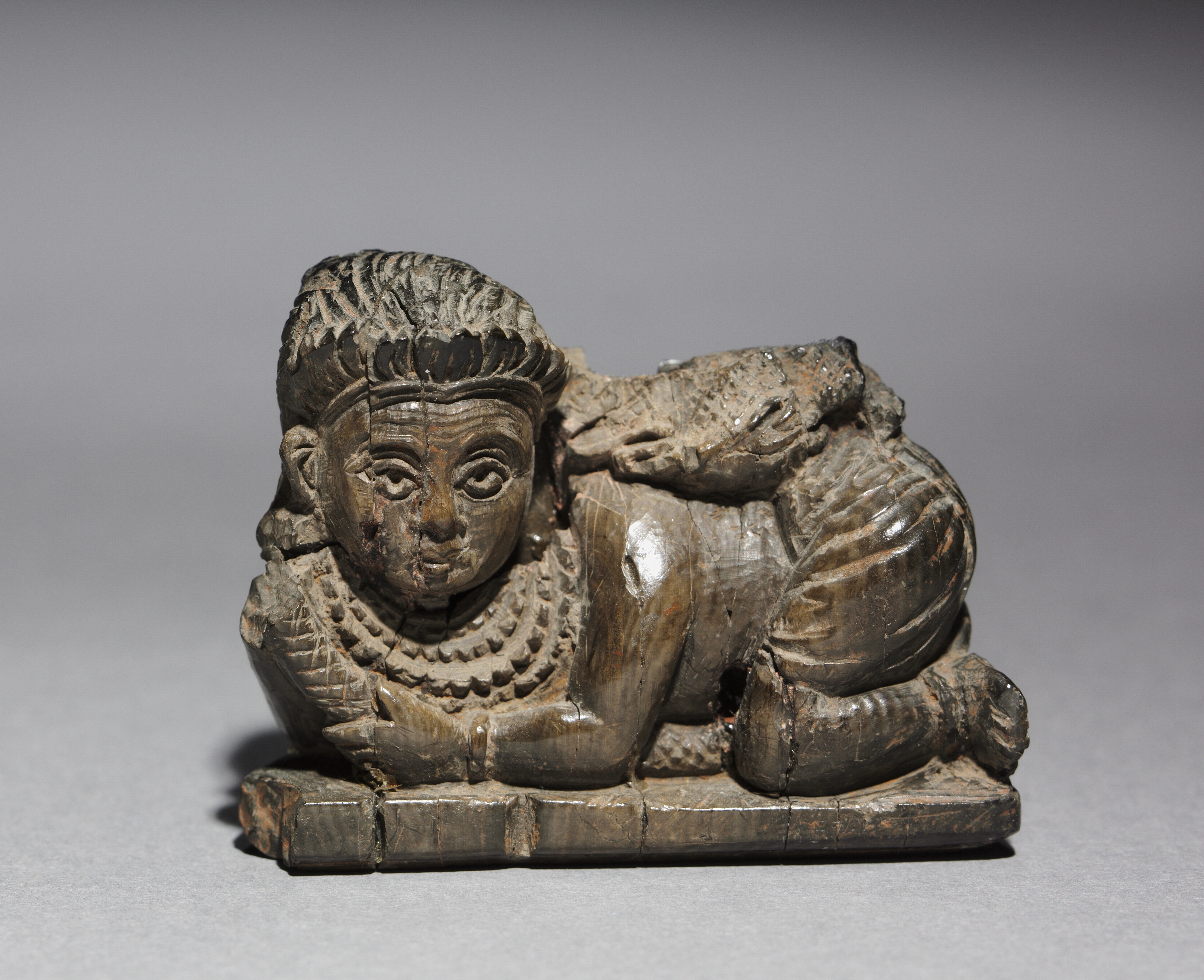 The stone sculpture depicts a crouching woman, titled "Figurine of a Crouching Woman". The sculpture is made of dark gray stone with a weathered appearance. The woman has a human-like head with short hair, a nose, and eyes; her facial expression is neutral. She is wearing a necklace with multiple rows of beads. The woman's body is positioned in a crouching stance, with her elbows resting on her knees, arms bent at the elbows and hands in front of her. Her torso is bare and smooth. The woman's left leg is bent behind her, and her right leg is bent in front of her. The sculpture rests on a rectangular base. The background of the image is a plain grey color, with a subtle shadow cast by the sculpture. The overall style of the sculpture appears to be ancient or traditional.