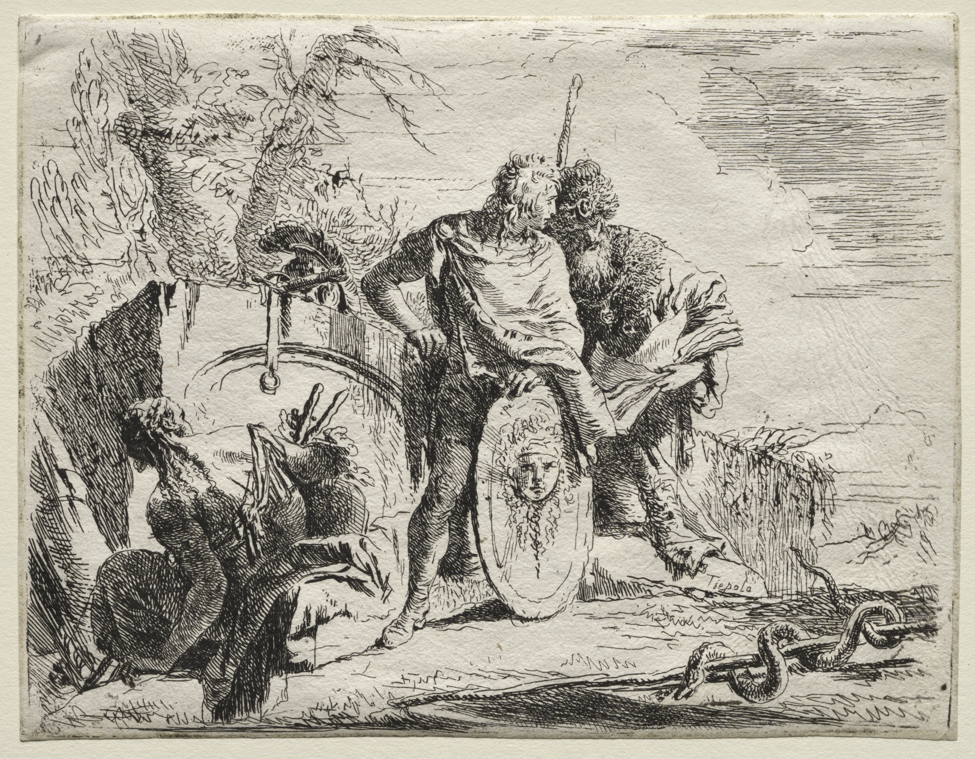 A black and white drawing on textured paper depicts two men. The man on the left stands, with shoulder-length hair and a cloth wrapped around his waist; one hand on his hip, a long spear tucked under his arm. He holds a shield with a woman's face on it in the other hand. The man on the right stands bent over, looking down. A wheelbarrow or cart stands behind the men; it holds a basket or sack and a curved sword. To the left of the men, a pile of weapons. A tree on the left. The background shows a distant sky and clouds. The drawing is signed in the lower right corner. A border surrounds the drawing on the paper.