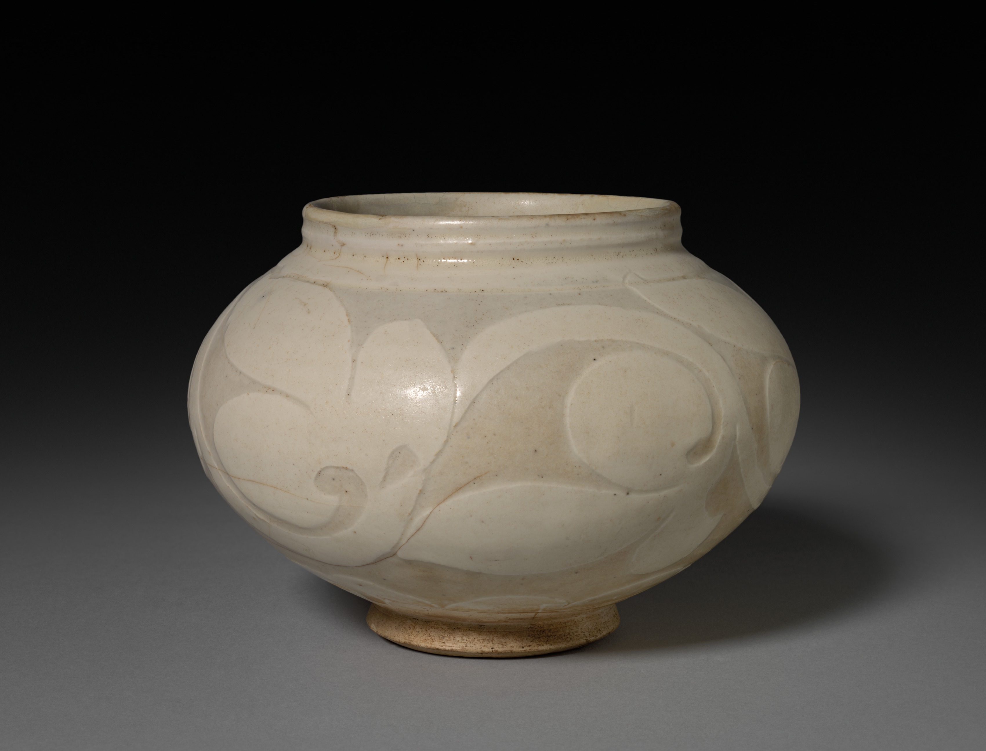 White ceramic jar with rounded body and short neck. The jar features a glossy white glaze with raised, carved floral patterns. It has a small, flat foot at the base. The background is dark gray to black, with a shadow cast to the right. The jar appears to be Cizhou ware.