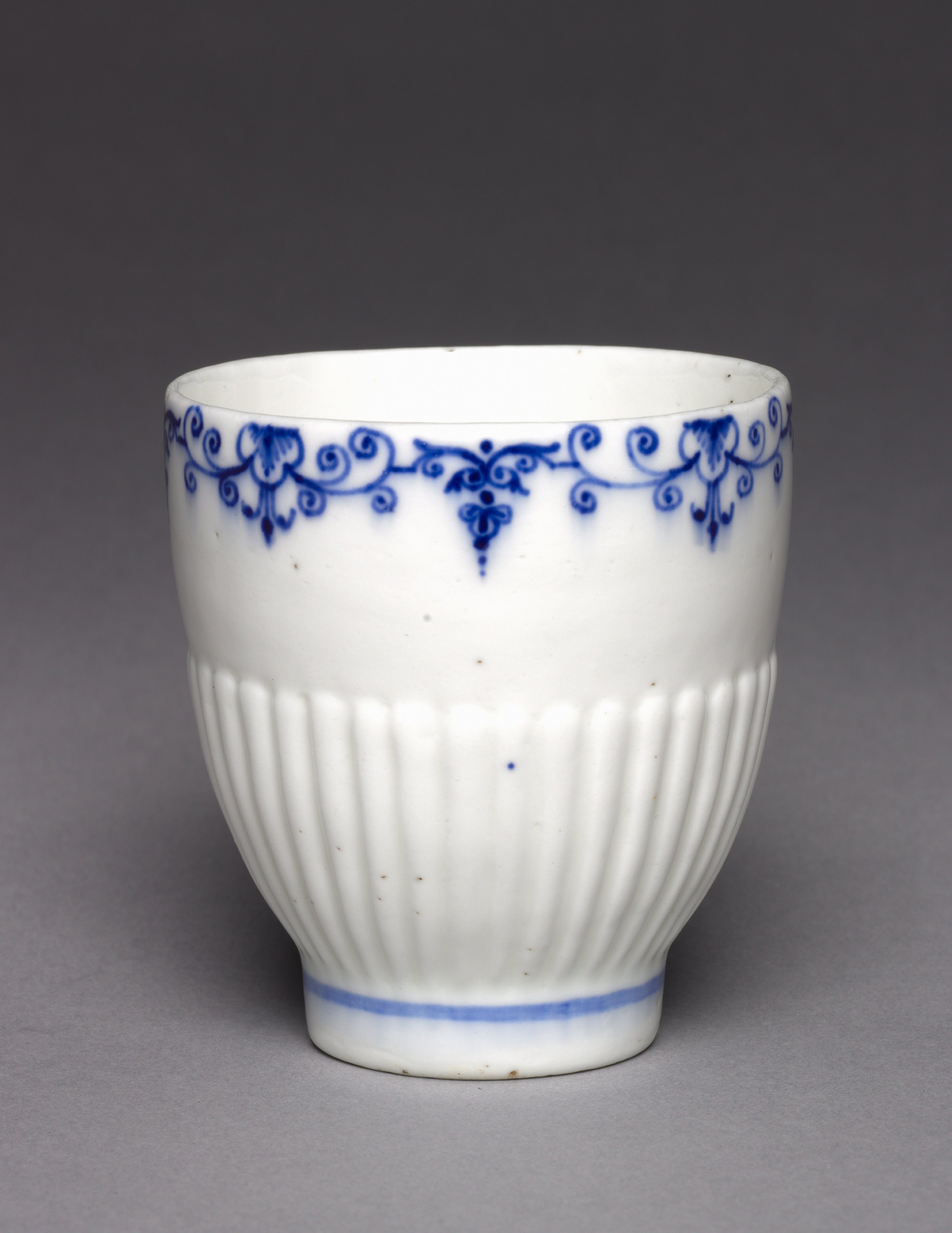 White ceramic cup with a wide mouth and a fluted lower body. The upper portion features a blue floral design around its circumference. A single blue stripe encircles the lower part of the cup. The cup has a short foot and sits on a gray surface with a dark background.