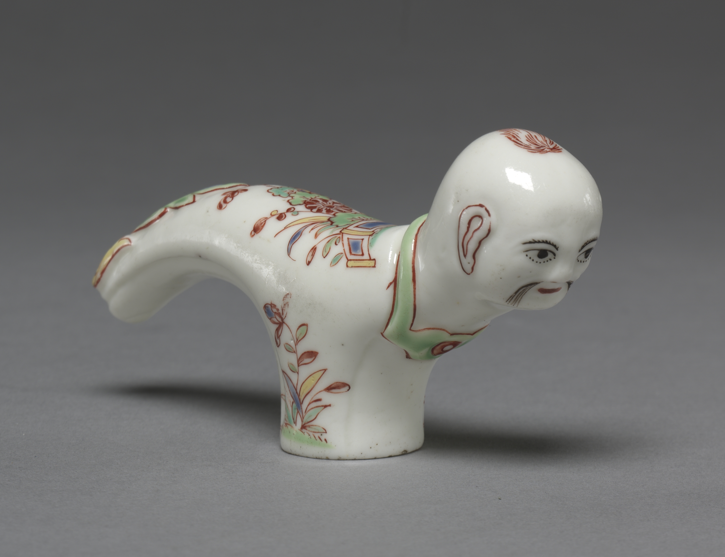White porcelain cane handle in the shape of a humanoid figure with a smooth, bald head, small ears, large eyes with dots of black for eyelashes, thin mustache and eyebrows, and a small mouth. The body has a rounded bump on top, a cylindrical base, and a curved end. The figure has colorful designs including red, green, blue, and yellow painted leaves and geometric patterns. The background is gray.