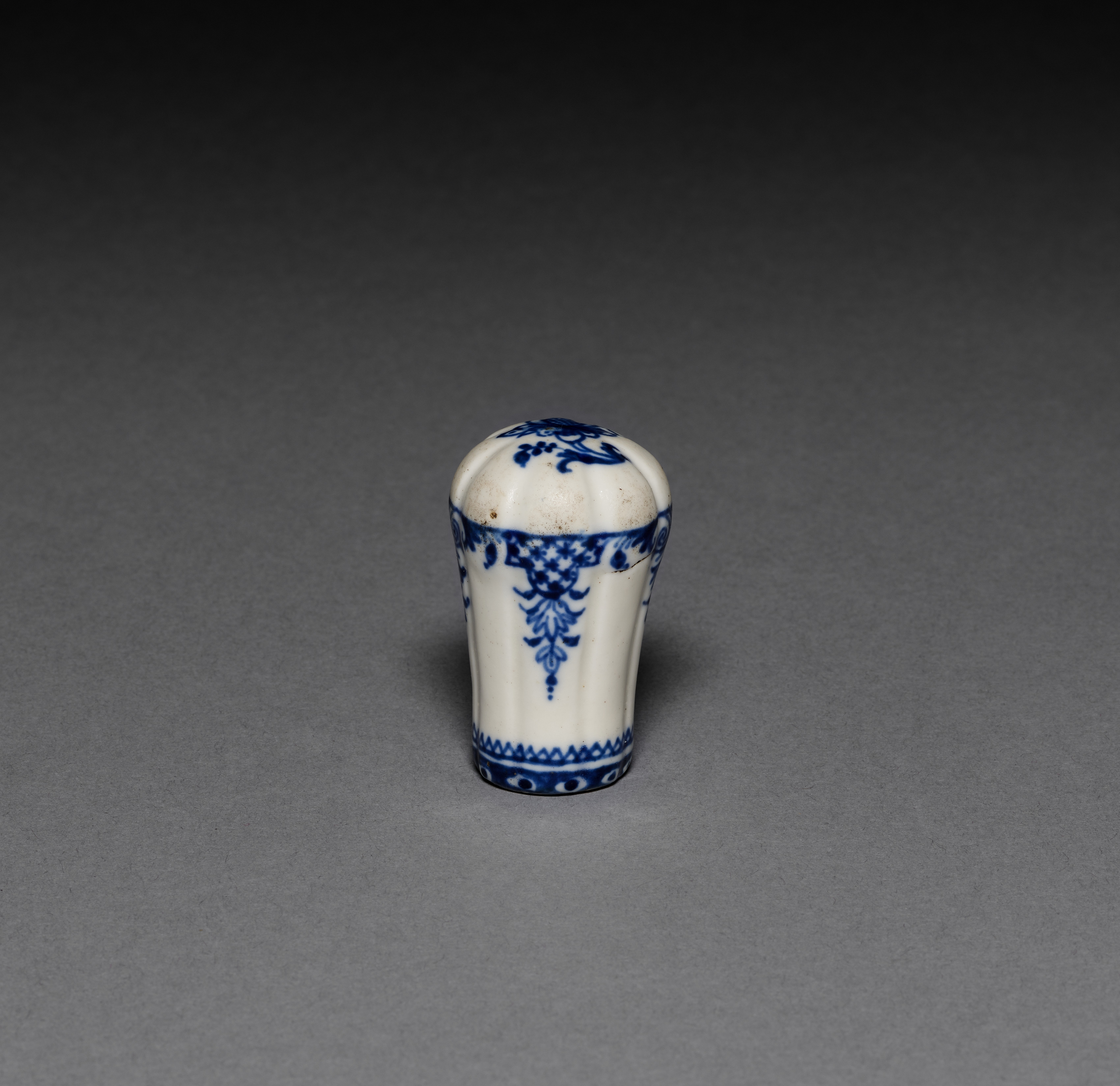 White porcelain object with a rounded top and a fluted body, featuring blue floral designs and patterns. The object has a small base and a rounded top. There are blue designs on the top and bottom edges, and a larger blue floral design on the side. The object is placed on a gray surface with a shadow underneath. The background is dark gray.