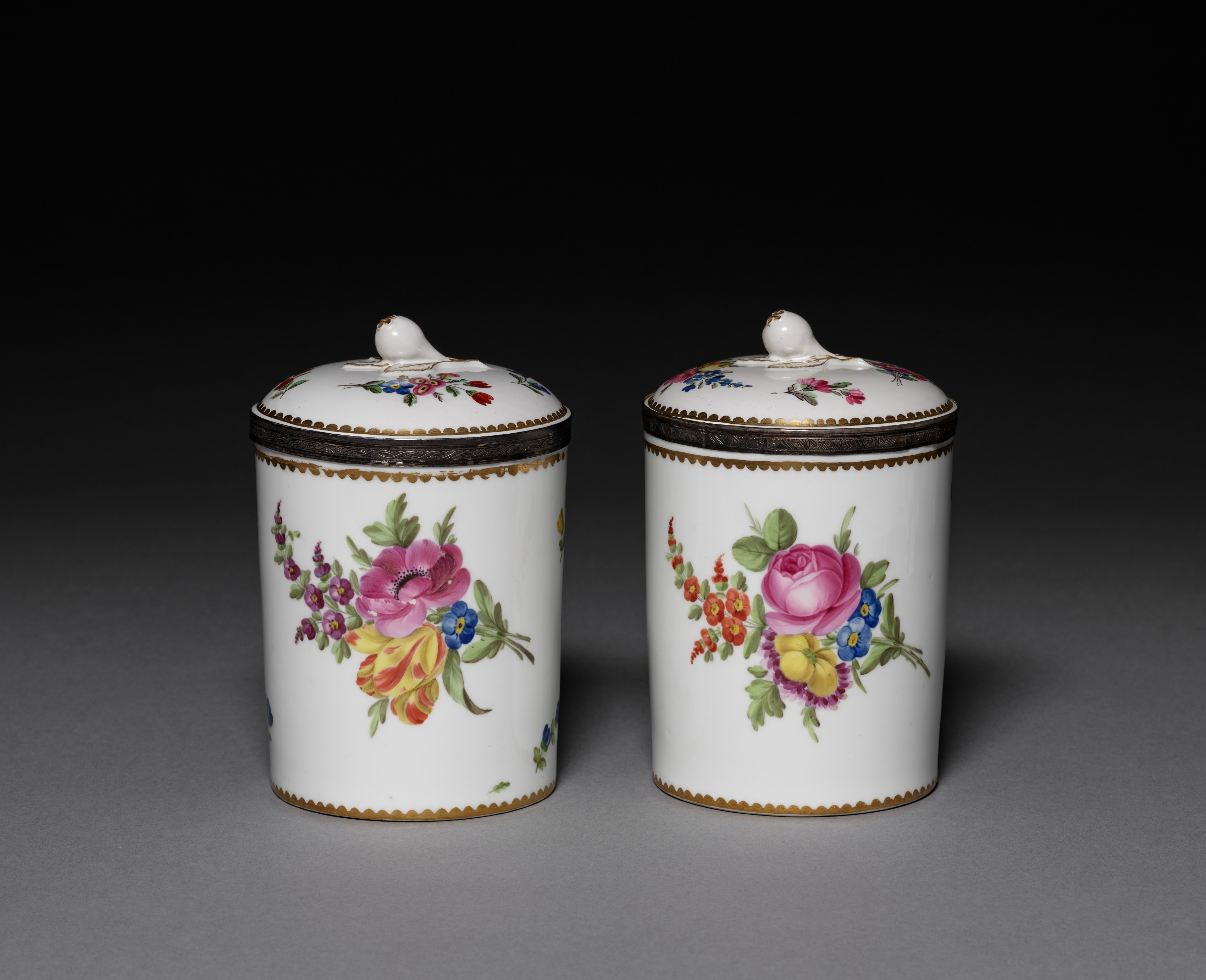 Two white porcelain jars with lids. The jars are cylindrical. The lids are domed with a small finial on top. The jars have a gold scalloped band at the top and bottom. The lids have a gold scalloped band around the edge. The jars have floral designs with pink, purple, blue, yellow and red flowers. The background is dark gray to black, with the jars casting a shadow.