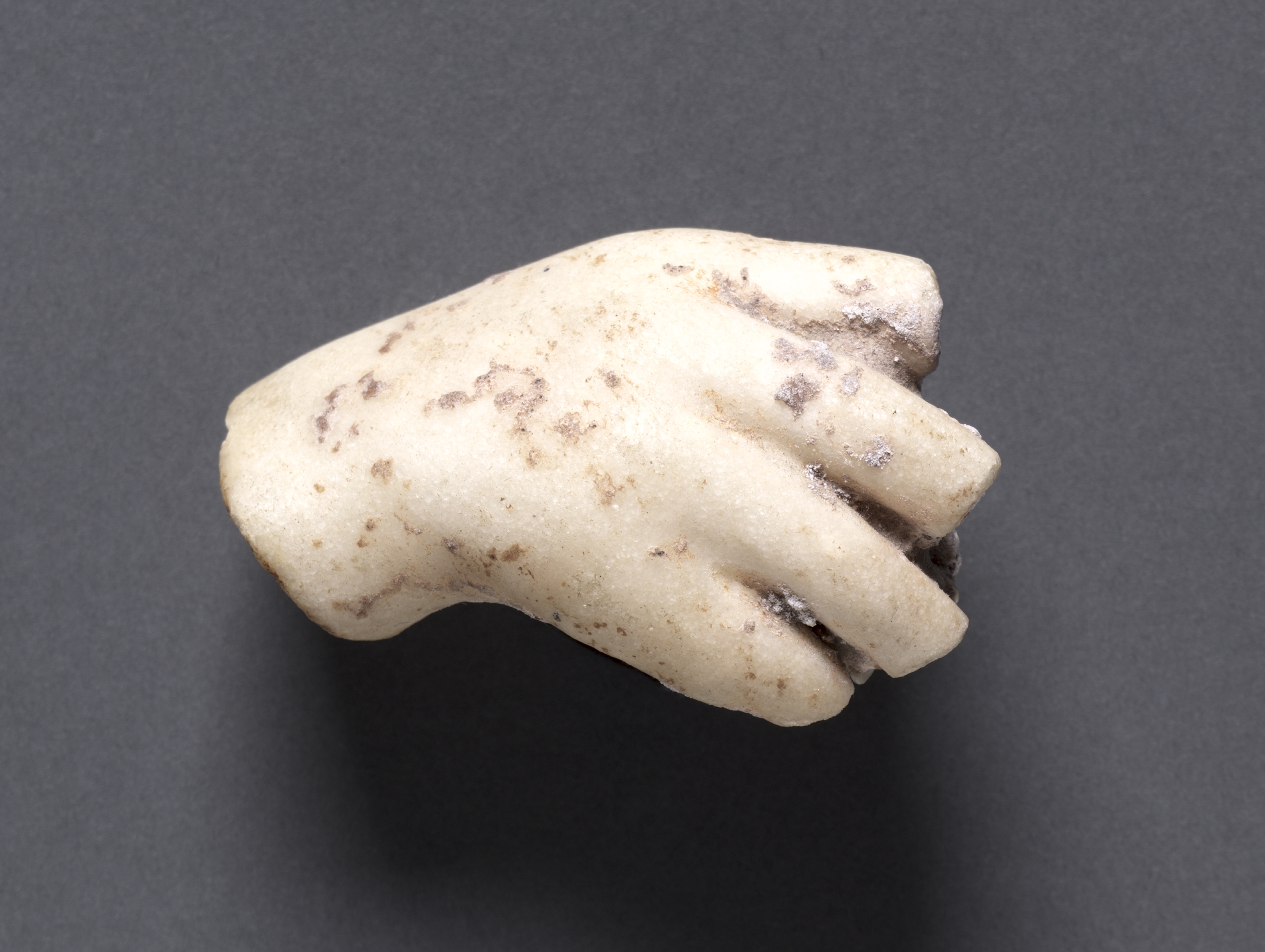 Fragment sent with "Dancing Lady": Fragment of a Proper Right Hand by Hermione Gingell. A small sculpture of a right hand made from beige stone with dark-brown spots. The hand has four fingers and a thumb. The thumb and fingers are bent down towards the palm. The fingernails are not defined. The stone is rough and unpolished with visible striations and flecks. The background is dark gray.