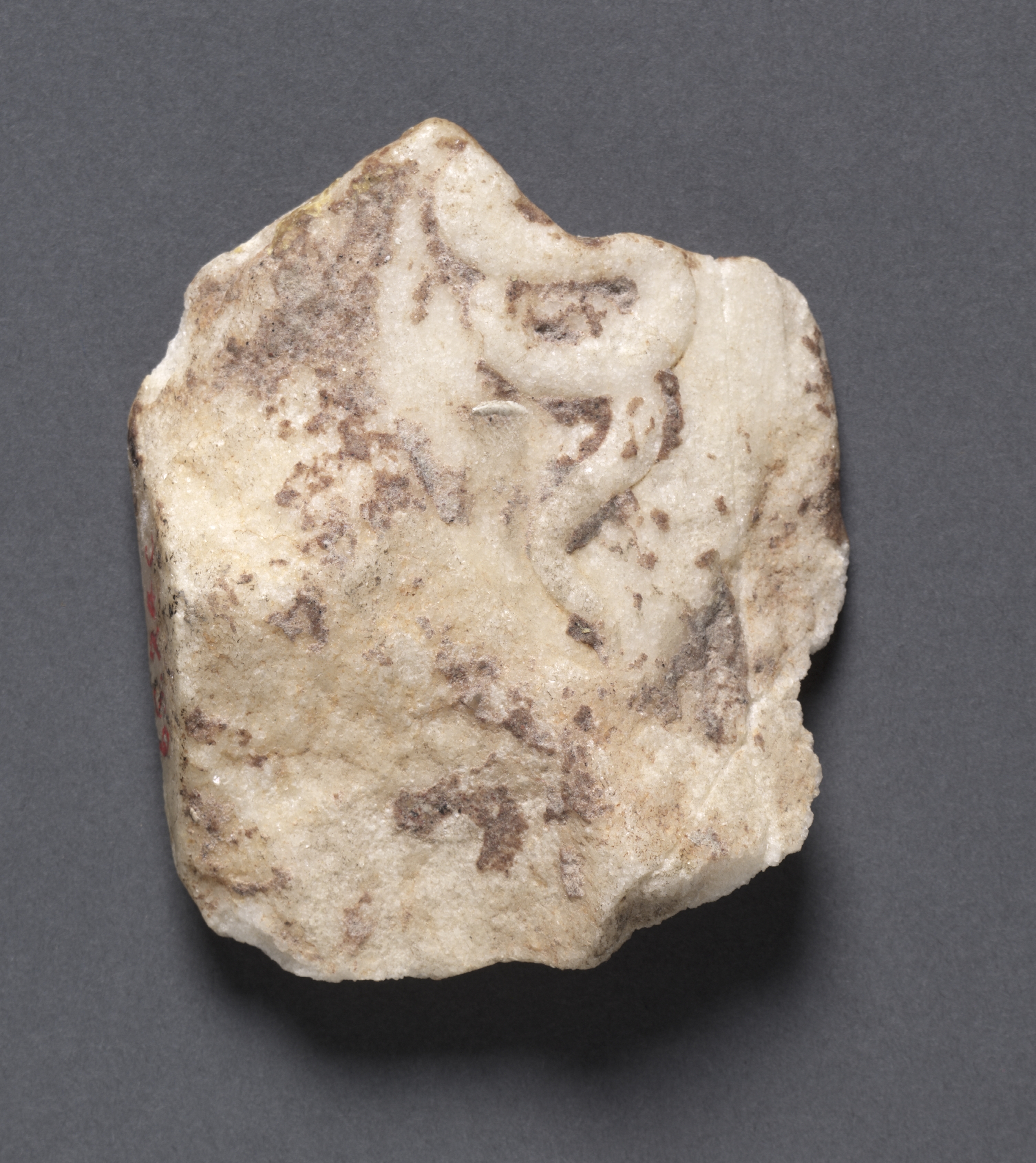 Fragment sent with "Dancing Lady": Serpent in Relief by Unknown. A fragment of a carved stone, likely marble or limestone, features a relief sculpture. The stone is predominantly beige with brown spots and has an irregular shape. It is positioned on a dark gray background. The relief depicts a serpent. The stone's surface shows signs of weathering and aging. The edges of the stone are rough and uneven. The background is solid and flat.