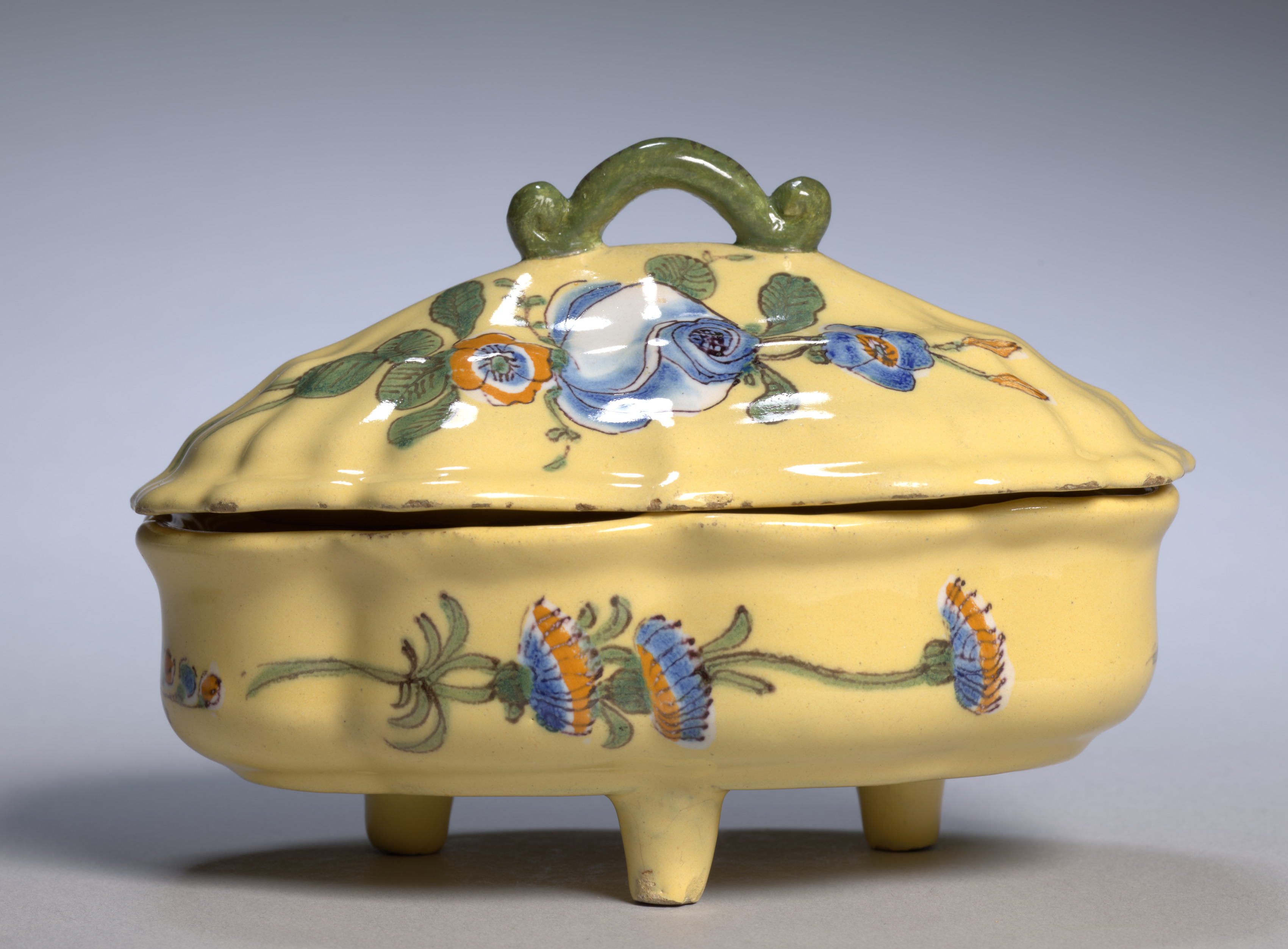 Yellow covered spice bowl with a floral design. The bowl has a rounded rectangular body with three legs and a domed lid with a green loop handle. The body and lid are decorated with a floral pattern featuring blue, orange, and white flowers with green leaves on a yellow background.