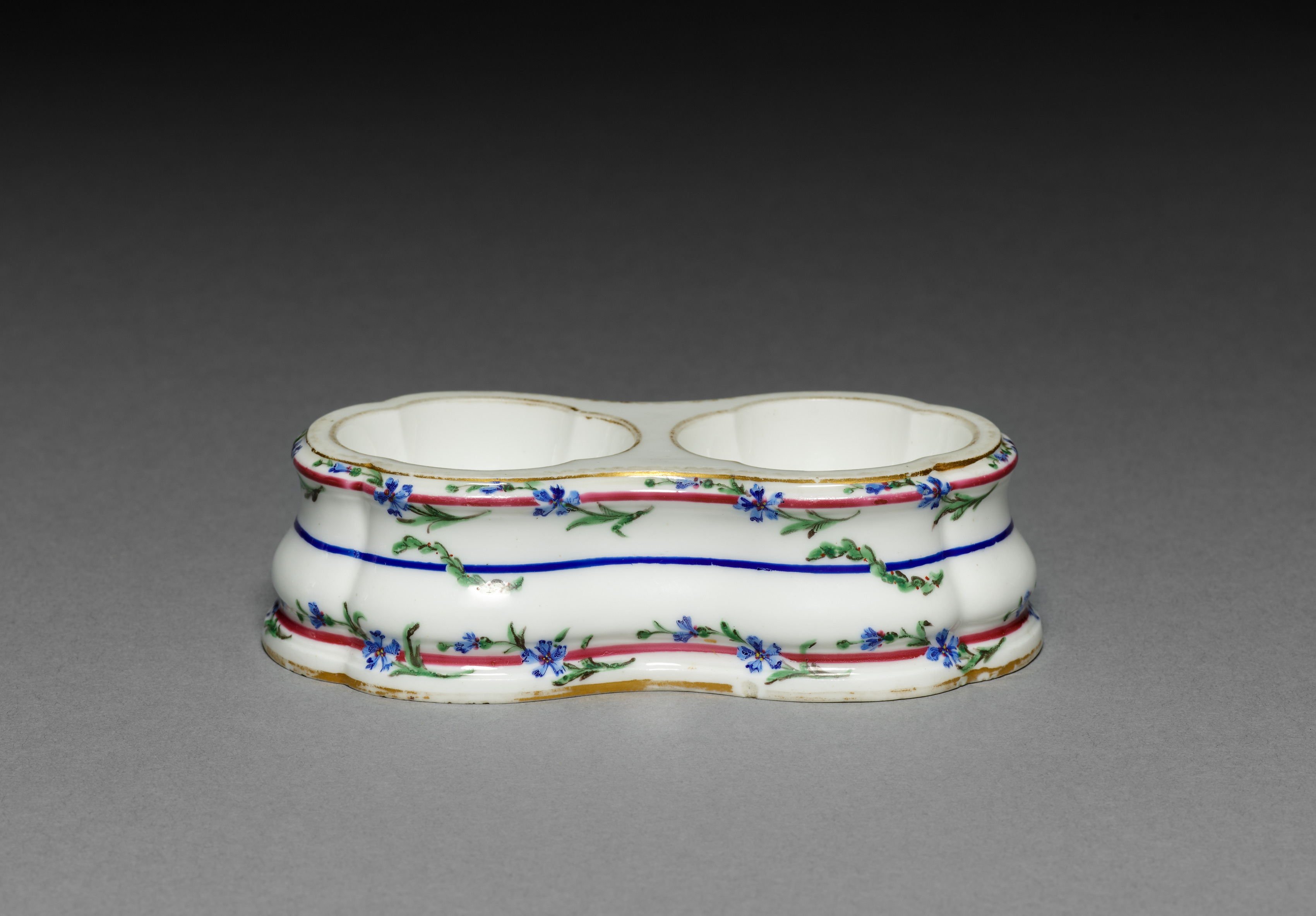 White porcelain double salt dish with two round openings side by side. The dish has a wavy edge and a wavy body with three horizontal stripes around it. The top and bottom stripes are red, and the middle stripe is blue. Small blue flowers with green leaves are painted between and on the stripes. The base of the dish has gold trim. The background is gray, darker at the top and lighter at the bottom.