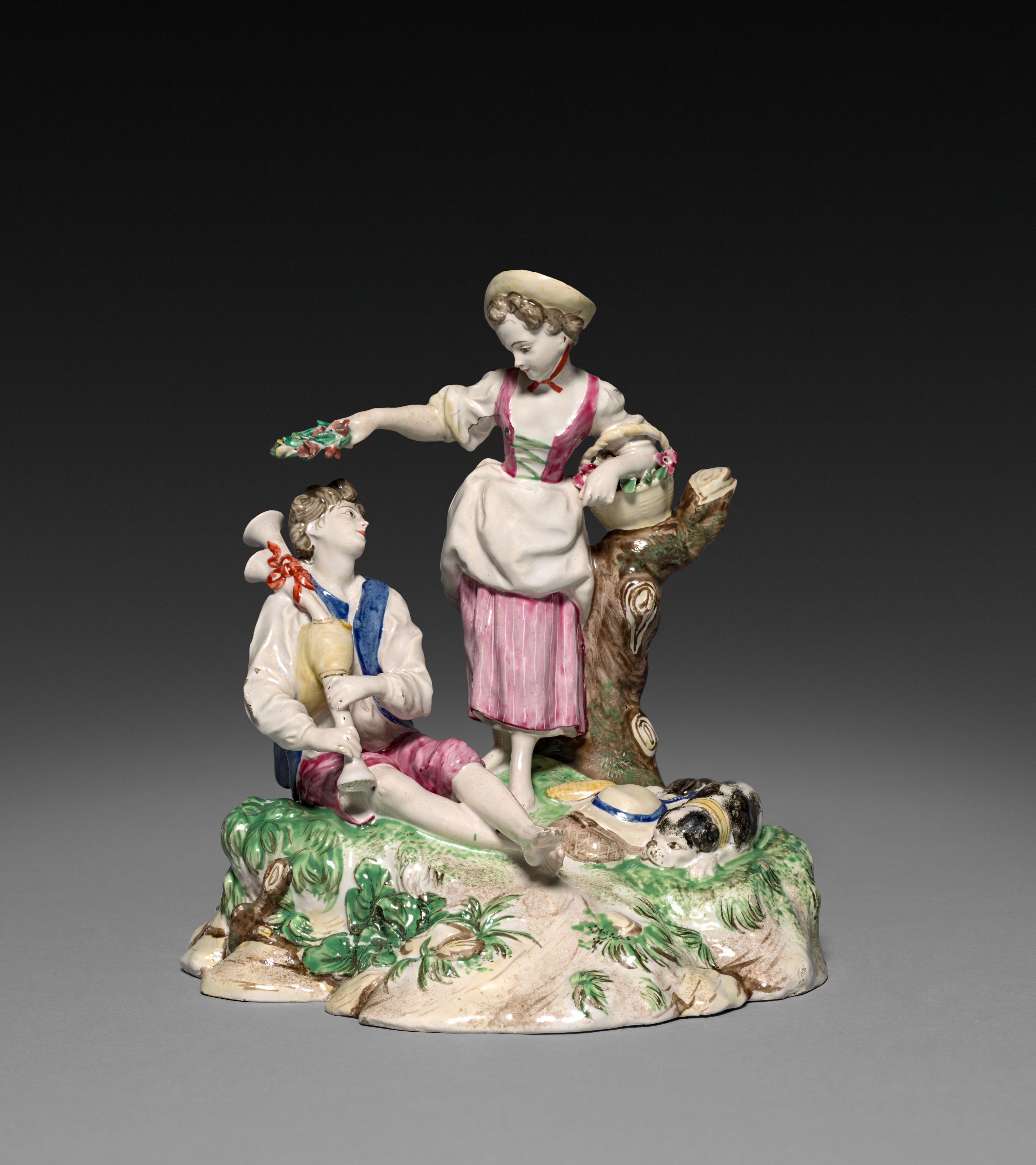 The figurine depicts a shepherd and a shepherdess. The shepherdess stands on the right wearing a white hat, a pink and white striped dress with a pink trim and a white apron. She has a basket in her left hand and a bunch of flowers in her right hand. The shepherd sits on the left wearing a white shirt, blue vest, pink shorts and a red bow on his right shoulder. He holds a pipe. A dog lies at their feet. The figurine sits on a base with green foliage and a tree trunk. The shepherdess's dress has pink and white vertical stripes. The shepherd's vest is blue. The dog is black and white. The background is dark gray.