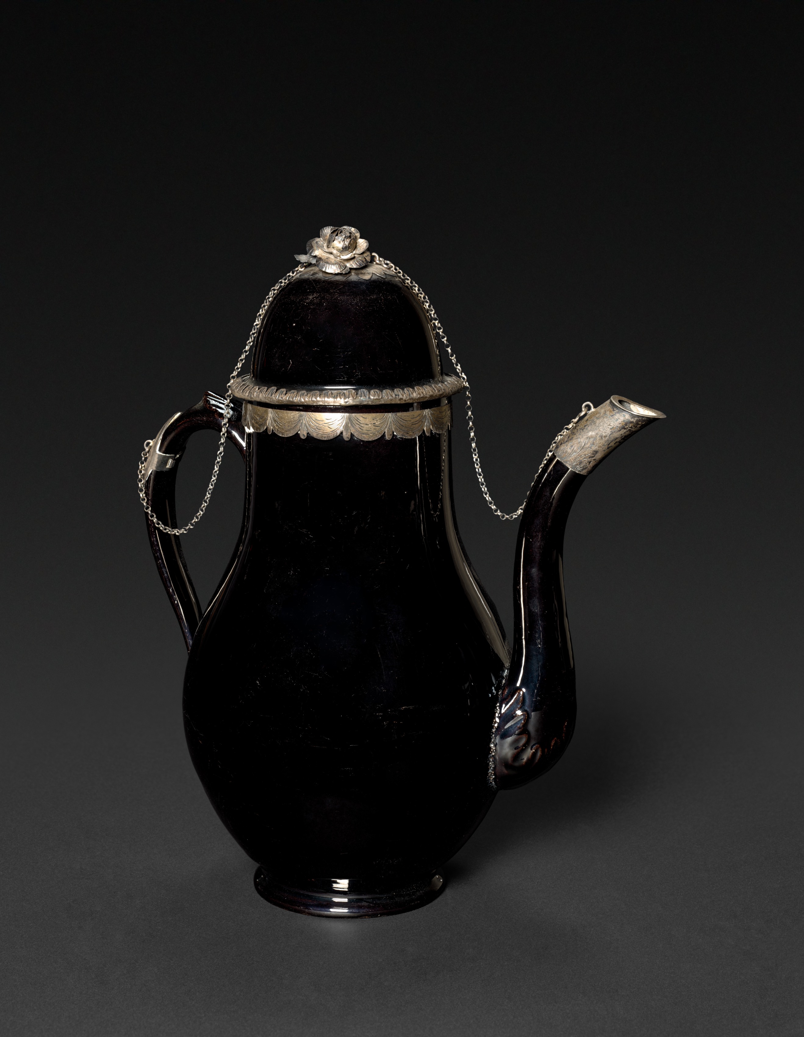 The image shows a black and silver coffee pot. The coffee pot is shiny and black with a silver lid and handle. The lid has a flower on top. There are silver chains attached to either side of the lid and the body of the coffee pot. The coffee pot's body is bulbous with a small foot at the bottom. The spout is on the right side and curves to the right. The handle is on the left side. The background is dark gray. The coffee pot appears to be titled "Coffee Pot" by an artist.