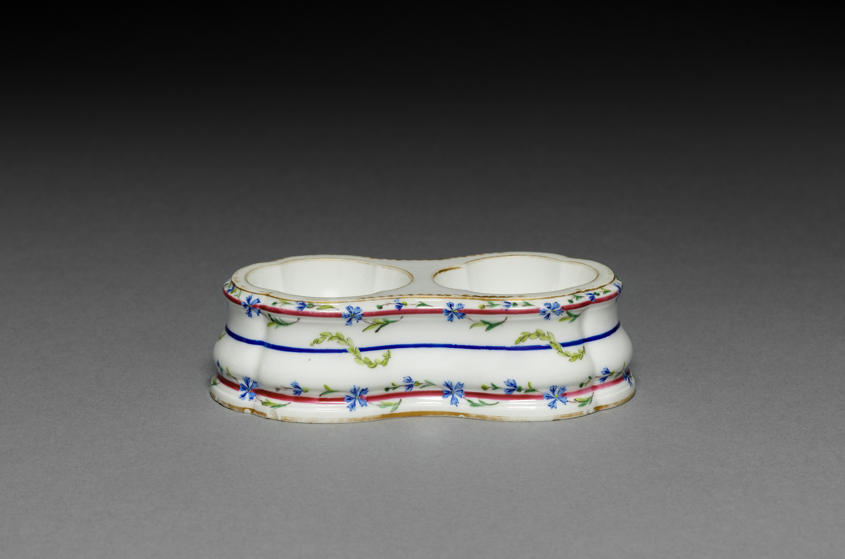 White porcelain dish with two circular openings. The dish has a wavy edge and a flat bottom. It features a blue, red, and gold stripe design around the middle, with blue flowers and green vines painted between and around the stripes. Gold accents are visible on the edges. The dish is symmetrical and has a small foot at the bottom. The background is a gradient from dark gray at the top to light gray at the bottom.