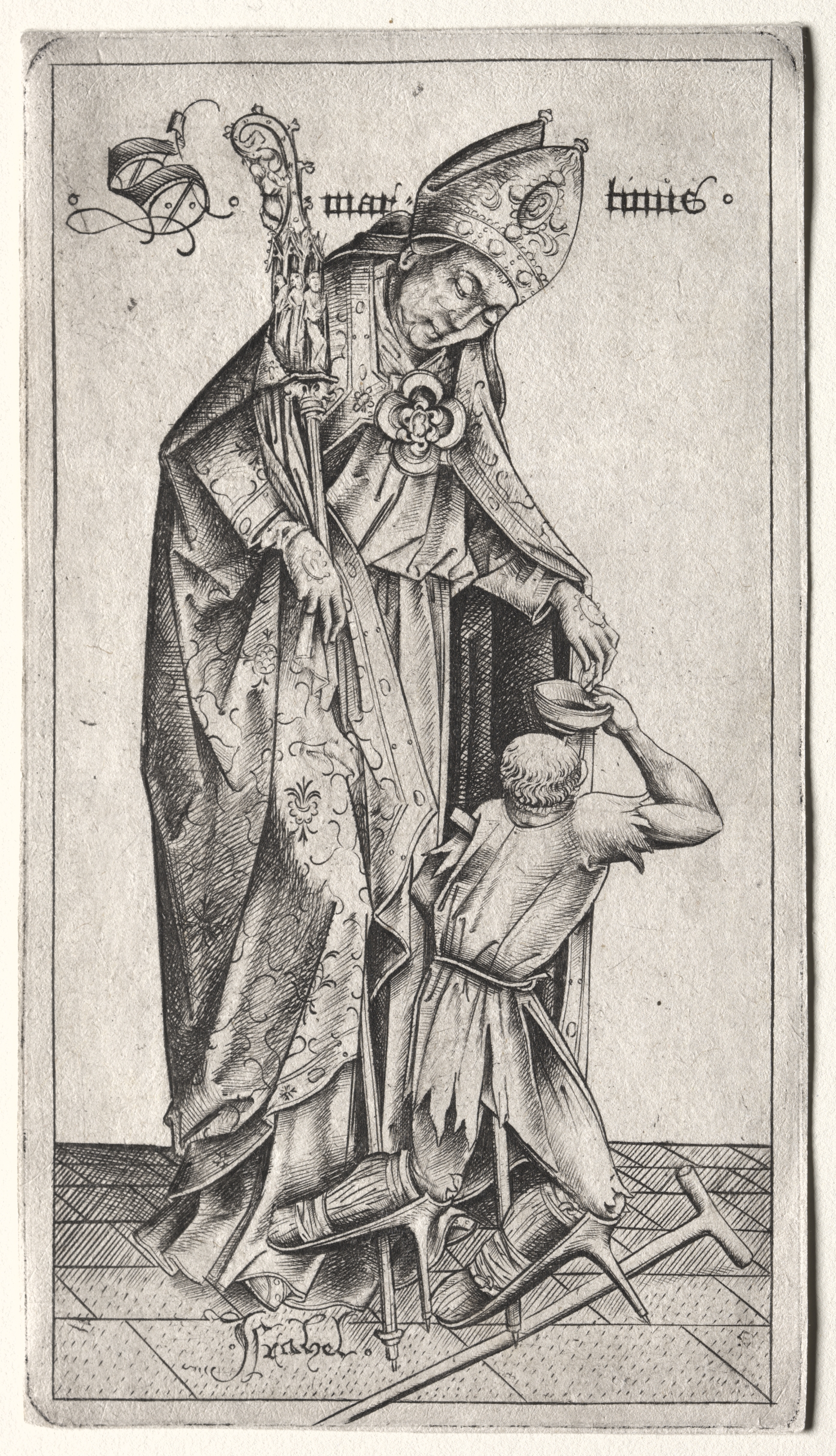 St. Martin by Israhel van Meckenem. A black and white image of a man in bishop's attire dividing his cloak with a sword to give half to another man. The bishop wears a mitre, a long robe with a floral pattern, and holds a staff in his right hand. A flower-like decoration is on his chest. He looks down at the other man. The other man, wearing a loincloth and knee-high boots, kneels on one knee and holds up a bowl. He appears to be half-naked. The background shows a tiled floor and a plain wall. Text is written at the top. The image is bordered.