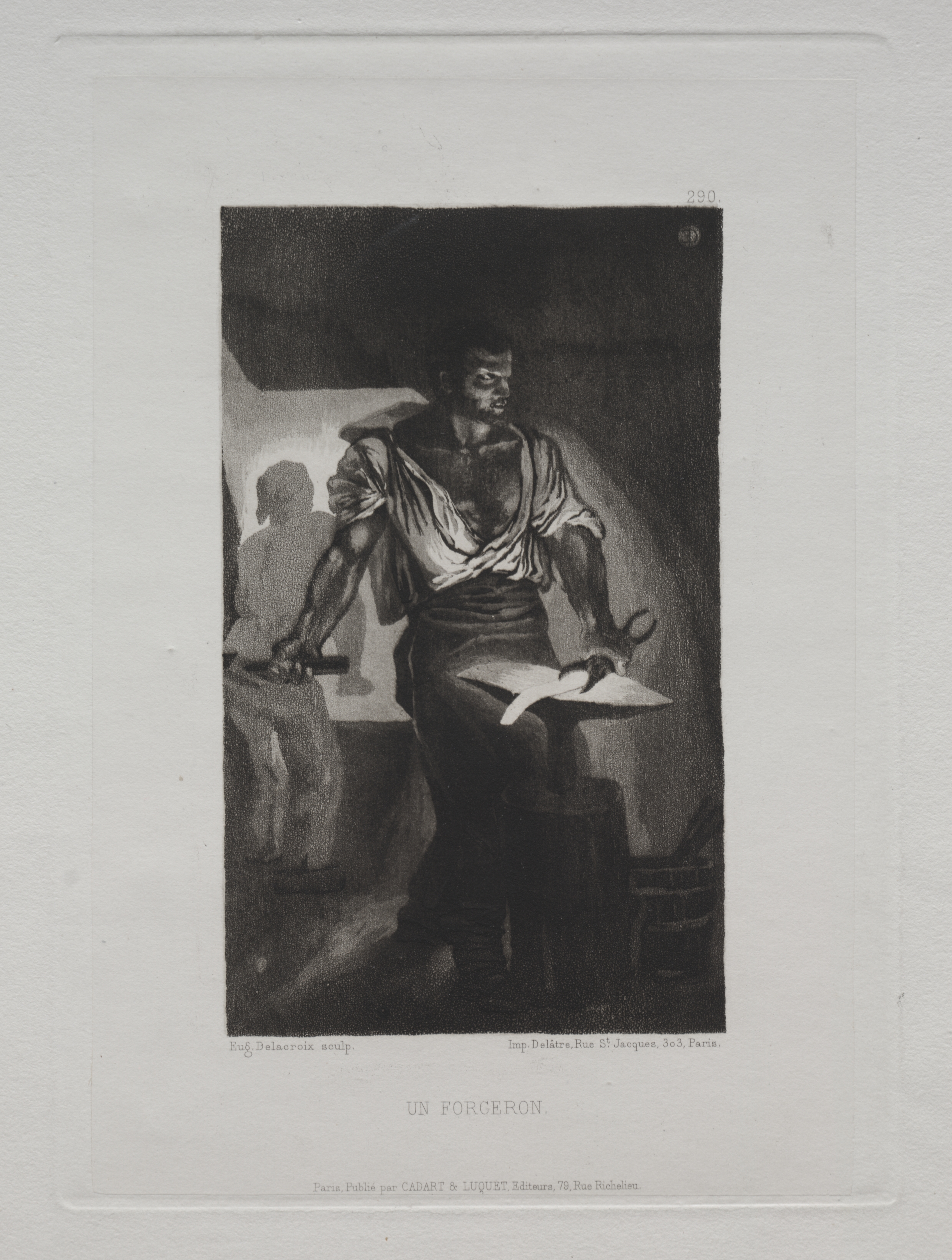 Black and white image of a man in a white shirt with sleeves rolled up and dark pants sitting and holding a piece of hot metal with tongs. The man has dark skin and short dark hair. He sits on a block with his left leg crossed over his right leg. His right arm rests on a surface beside him. A dark room with curved walls and a low ceiling surrounds him. A bucket sits in the background on the right. Text below the image reads "UN FORGERON".