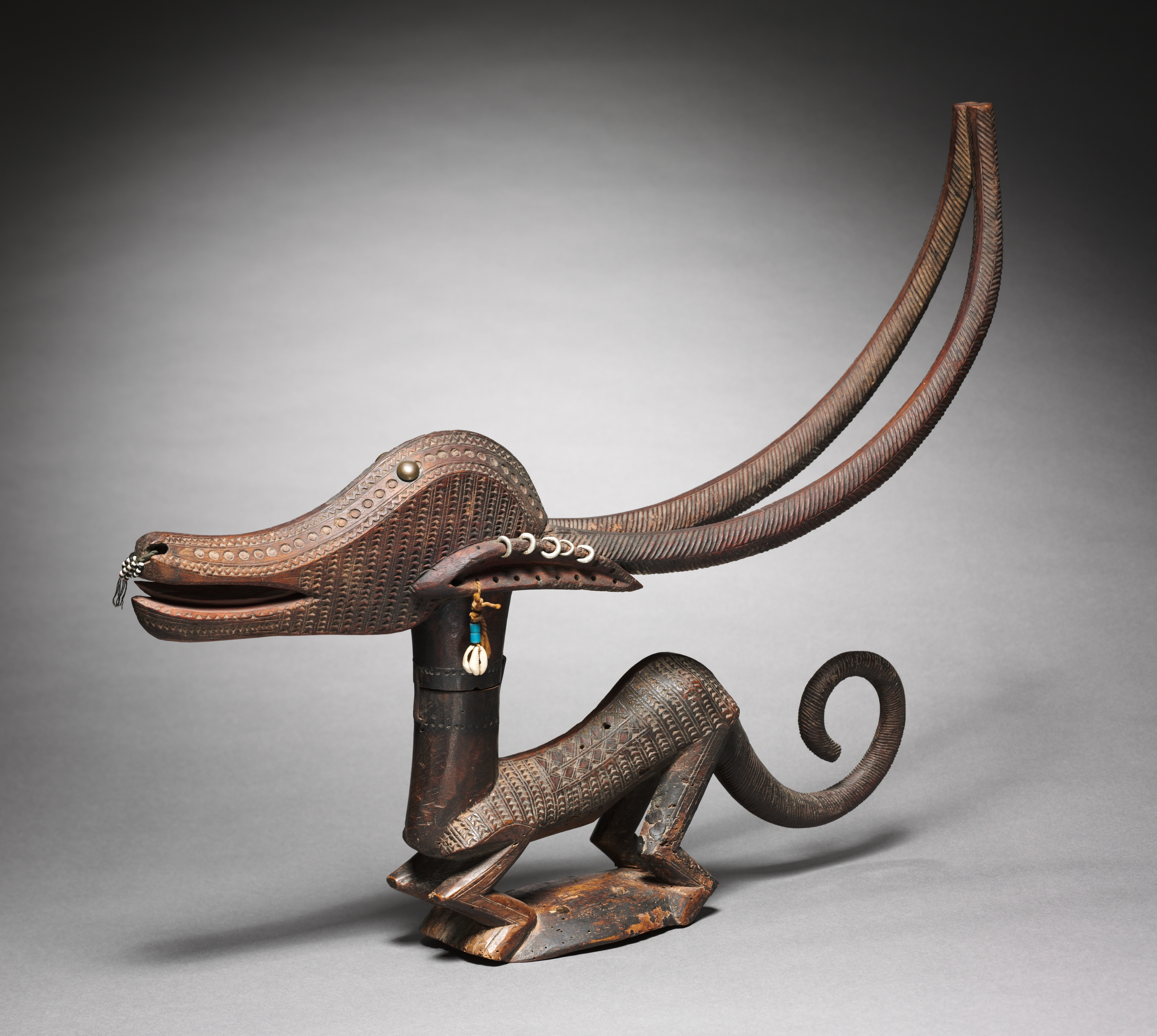 The Headdress (chi wara) by an unknown artist features a brown sculpture of an animal with a long snout and two long, curved horns. The animal's body is positioned on all fours, with a long tail curled upward. The sculpture has a textured surface and adorned with small beads or cowry shells. The head and body are connected by a cylindrical piece. The sculpture stands on a flat base with four legs. Two small decorative items hang on either side of the neck. The background of the image is gray, with a darker vignette effect around the edges.
