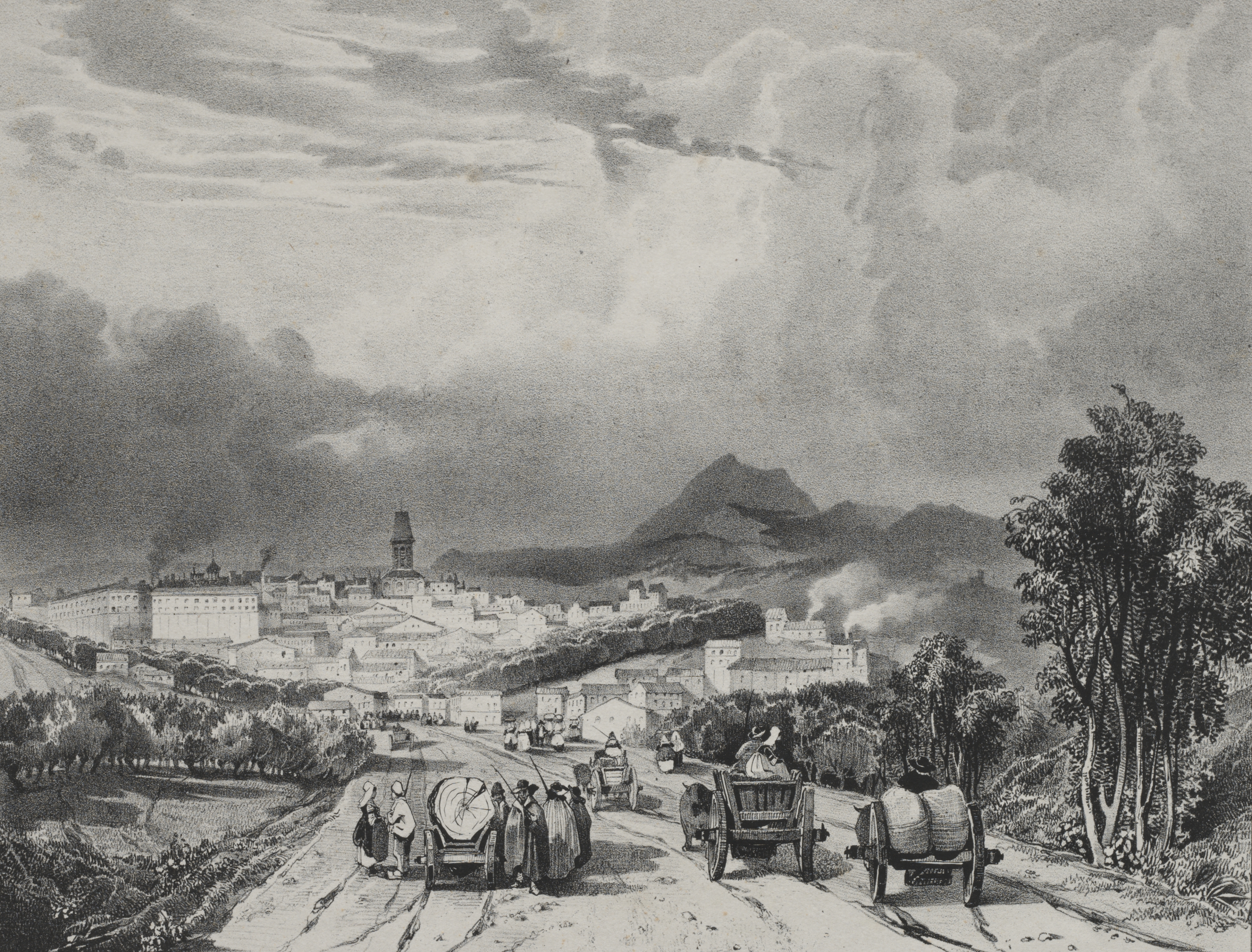 Black and white landscape scene. Dirt road in foreground with horse-drawn carts on it. People on and beside road. Trees beside and in background. Buildings on left side in background. Mountain range behind buildings. Cloudy sky. Title: Vue generale de Riom, Auvergne Artist: Adrien Dauzats.