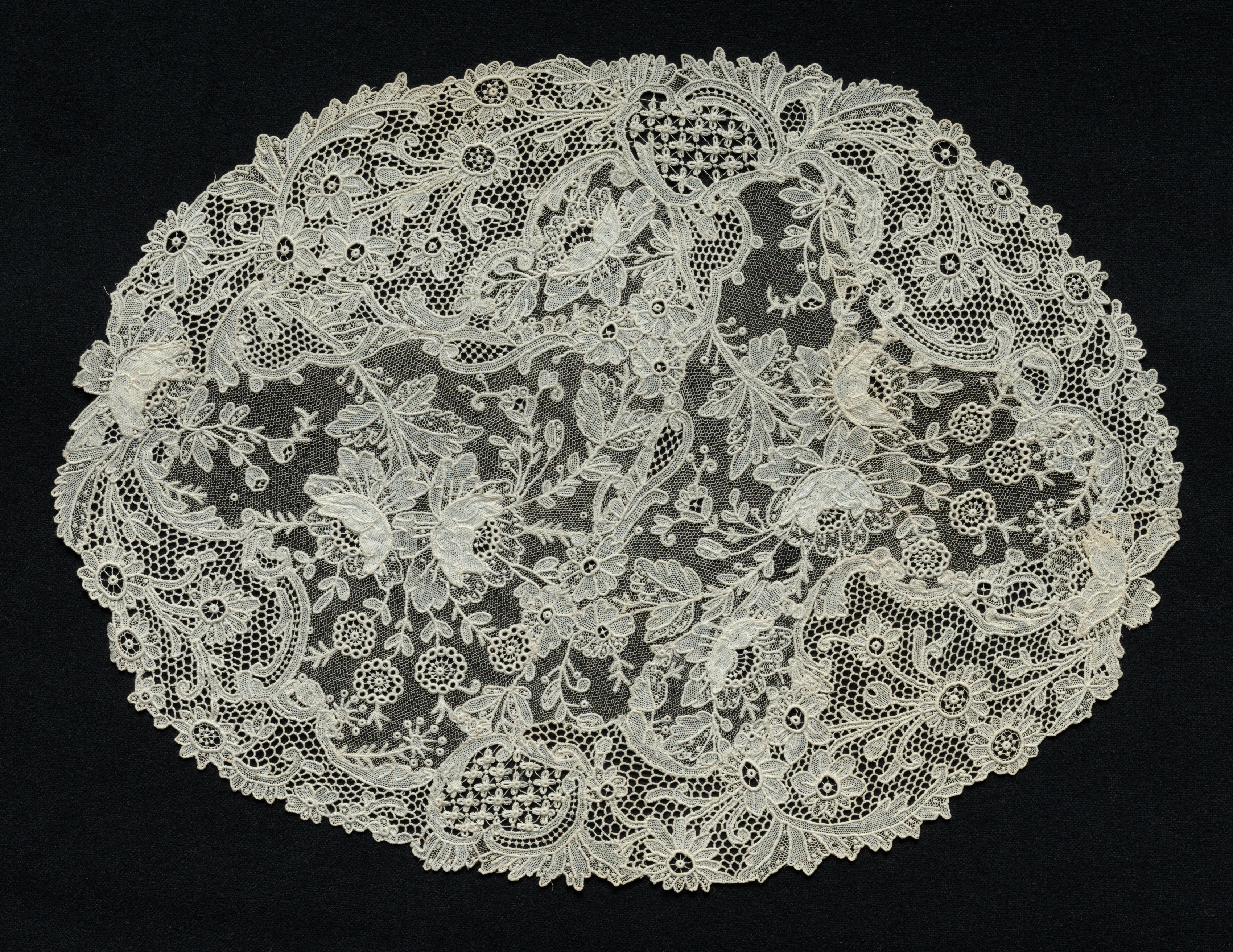 The image shows a piece of white lace against a black background. The lace is circular and features intricate floral patterns, leaves, and flowers. The lace has a delicate, open design with many small holes and a scalloped edge. The lace appears to be made of a thin, white material, possibly cotton or silk, and is likely a type of needlepoint or point d'gaze lace. The background of the image is solid black, which helps to highlight the details of the lace.
