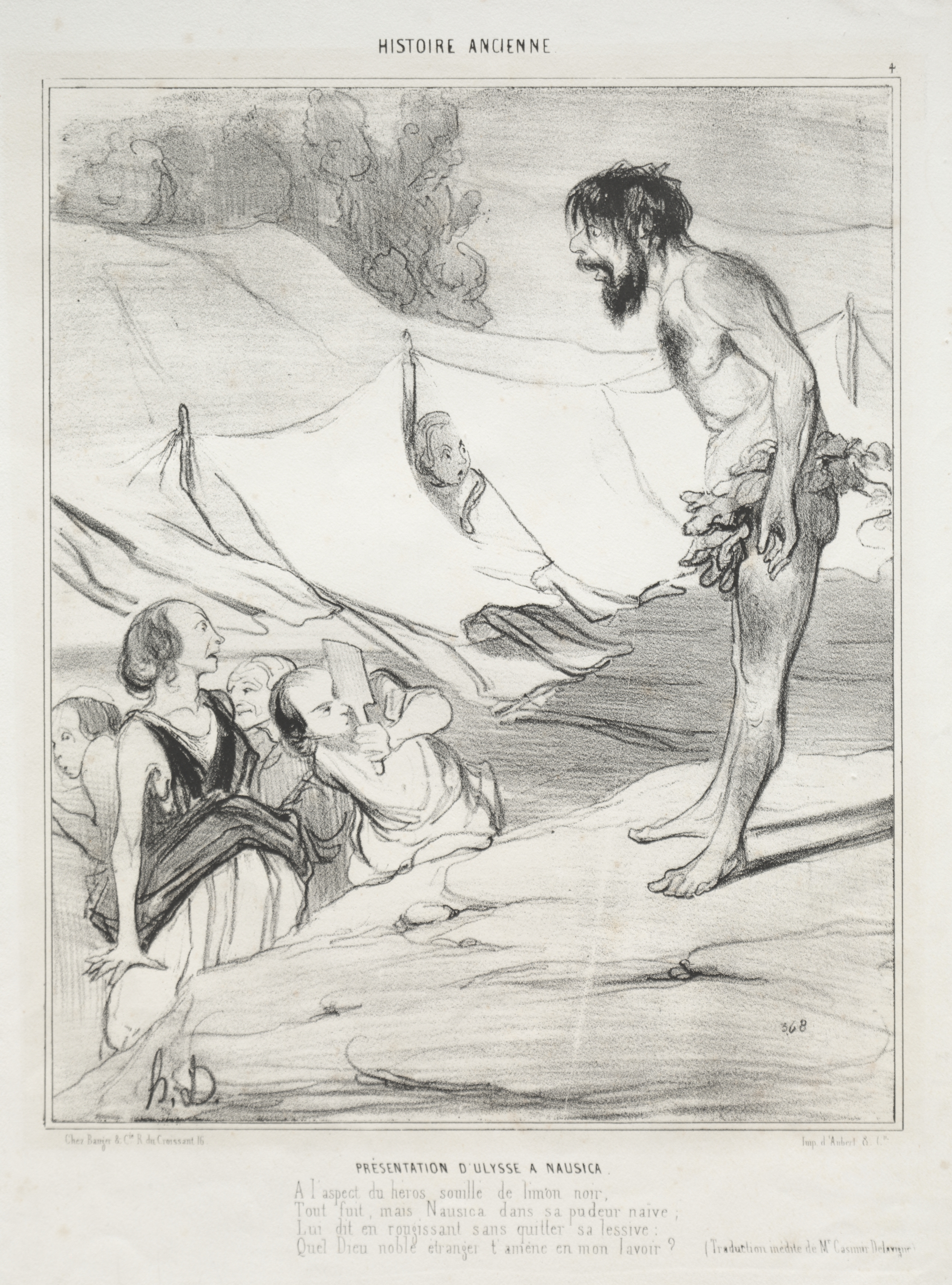 Black and white drawing of a man with a beard and dark hair standing on the right side wearing a cloth around his waist, looking to his left at a group of four women and a child. The man on the right is shirtless and barefoot. One woman kneels on the left and holds a sheet or fabric up to cover her and the children. A man in a white tunic sits on the ground behind her. The background has a tent on the left and trees on a hill in the top left corner. Text is printed at the top and bottom.