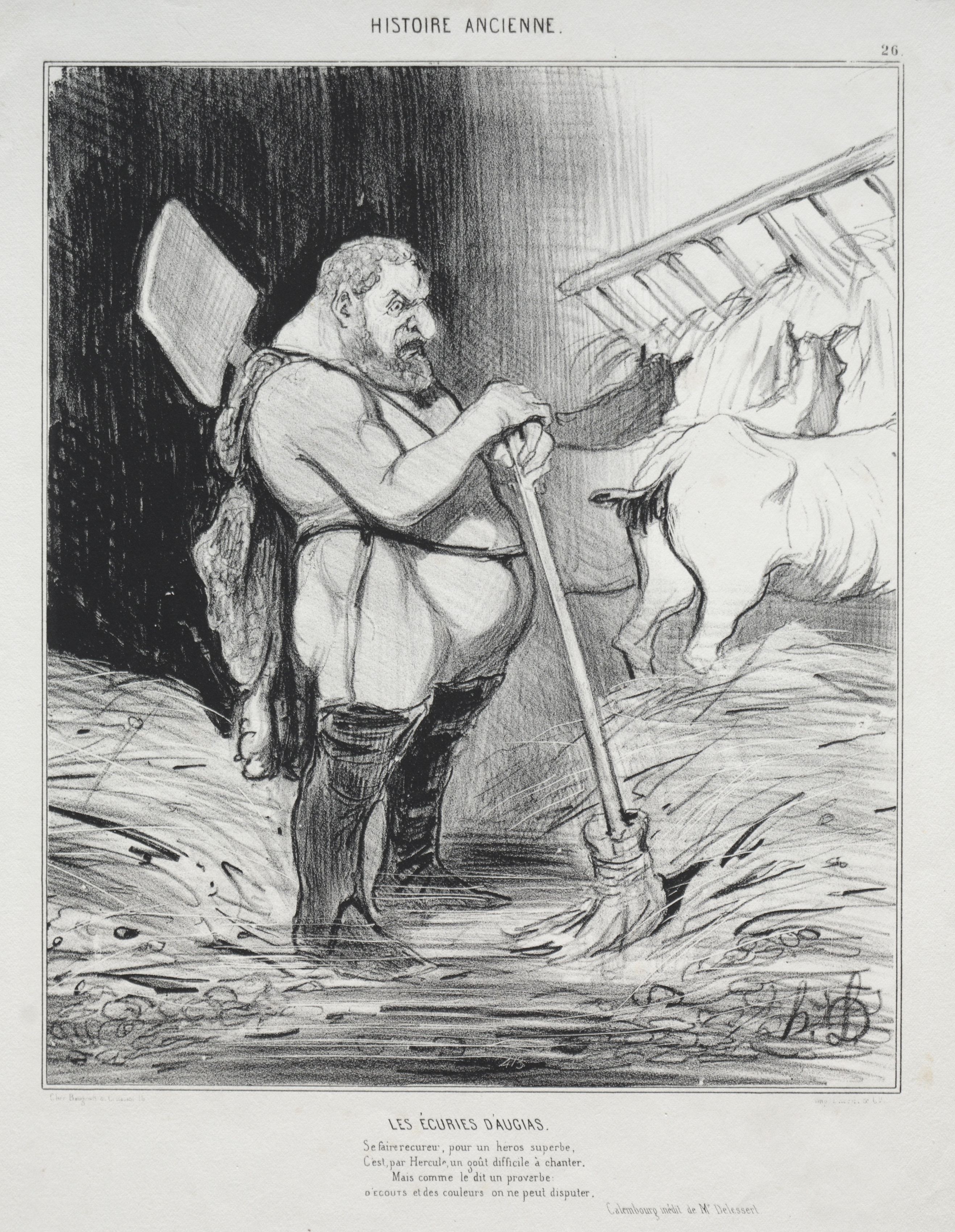 Black and white drawing of a man with short hair and a beard, wearing knee-high boots and no shirt or pants, holding a shovel. A pig is to the right of him. He appears to be standing in filth or mud. The background is dark on the left side and lighter on the right. Text at the top reads "HISTOIRE ANCIENNE". A number "26" is in the upper right corner. A title and text are at the bottom. The man has a large rear end and large muscles.