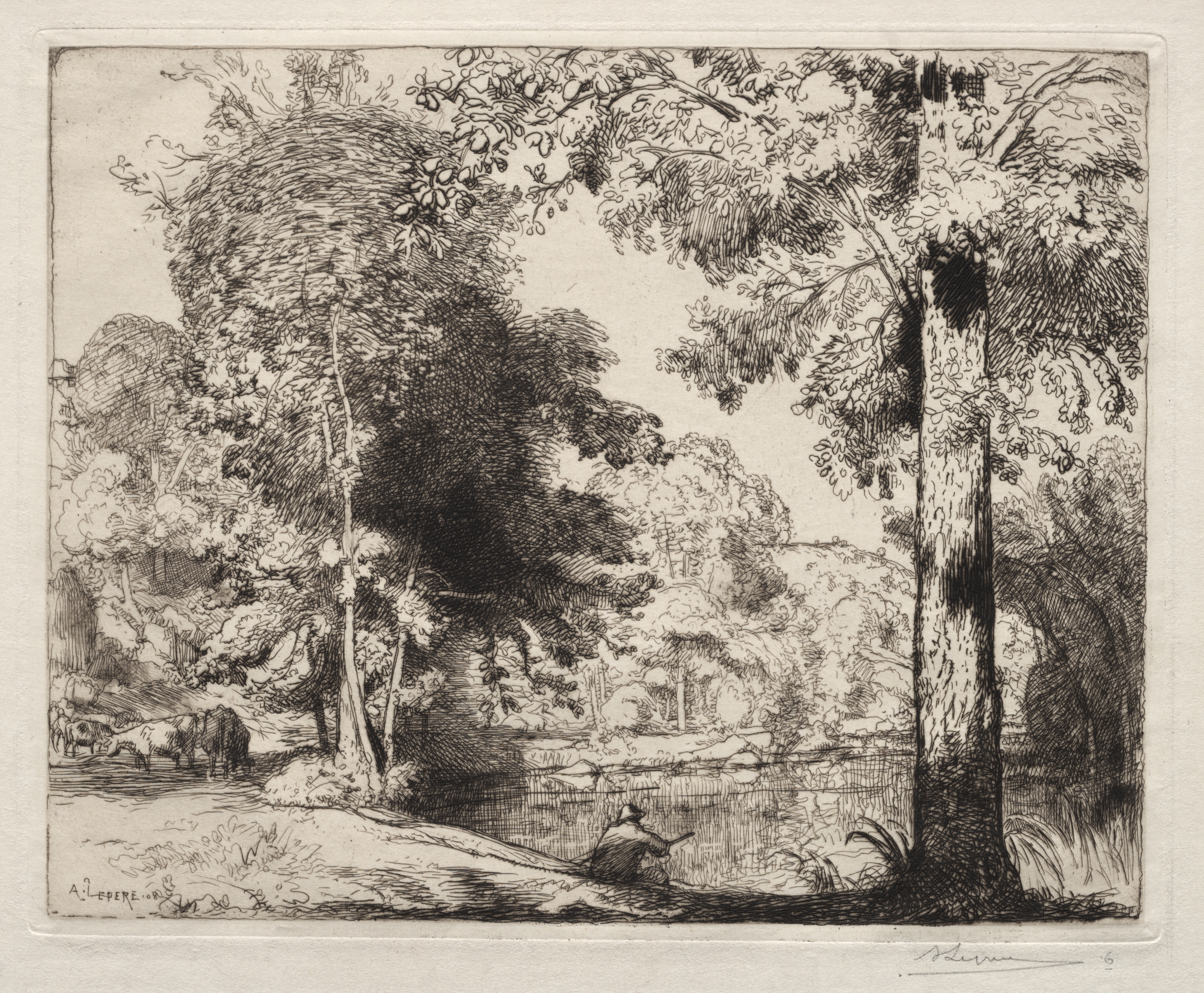 Black and white etching of a man sitting on the edge of a pond. The man sits on a grassy area which slopes down to the water on the right. The pond reflects the trees on its far side. A group of at least 5 animals stand by the pond on the left, near a tree. Trees are dense and cover most of the background. The trees on the right are darker and more defined. The trees on the left are lighter with less detail. The left and bottom edges of the etching are lighter in color. The entire image is surrounded by a raised border. The artist's signature is in the bottom left. The title of the work is "Bords de la Vie" and the artist is Auguste Louis Lepère.