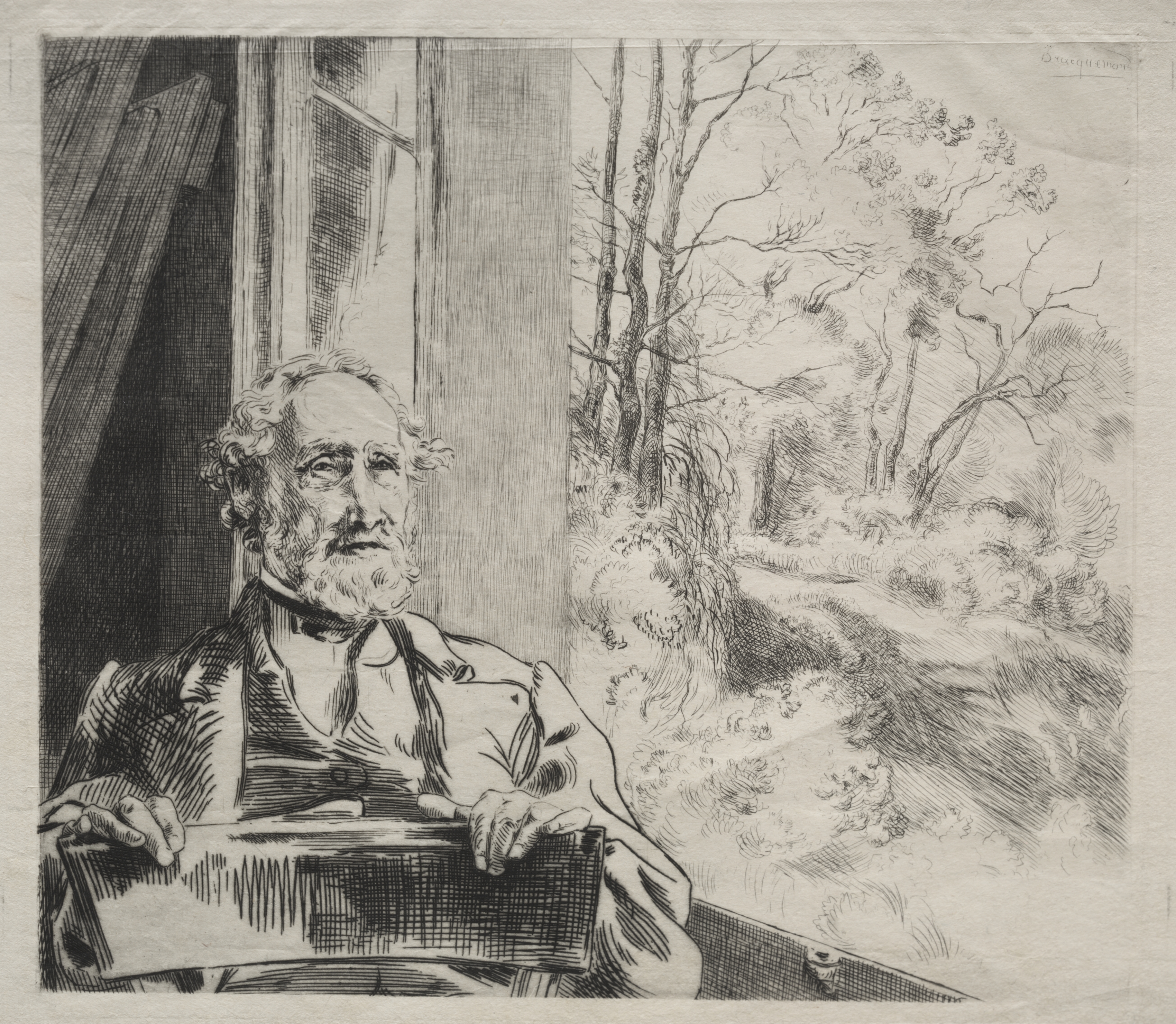 Black and white drawing of a man sitting on a train. The man has curly gray hair and a beard; he wears a suit jacket, collared shirt, and necktie. He leans on a railing with his elbows. A window is behind and to the left of him. Outside the window is a road with trees and bushes on both sides. The road curves to the right. Darker shading on the left side of the image. Lighter shading on the right. The drawing is titled "Meyer-Heine" by Félix Bracquemond.