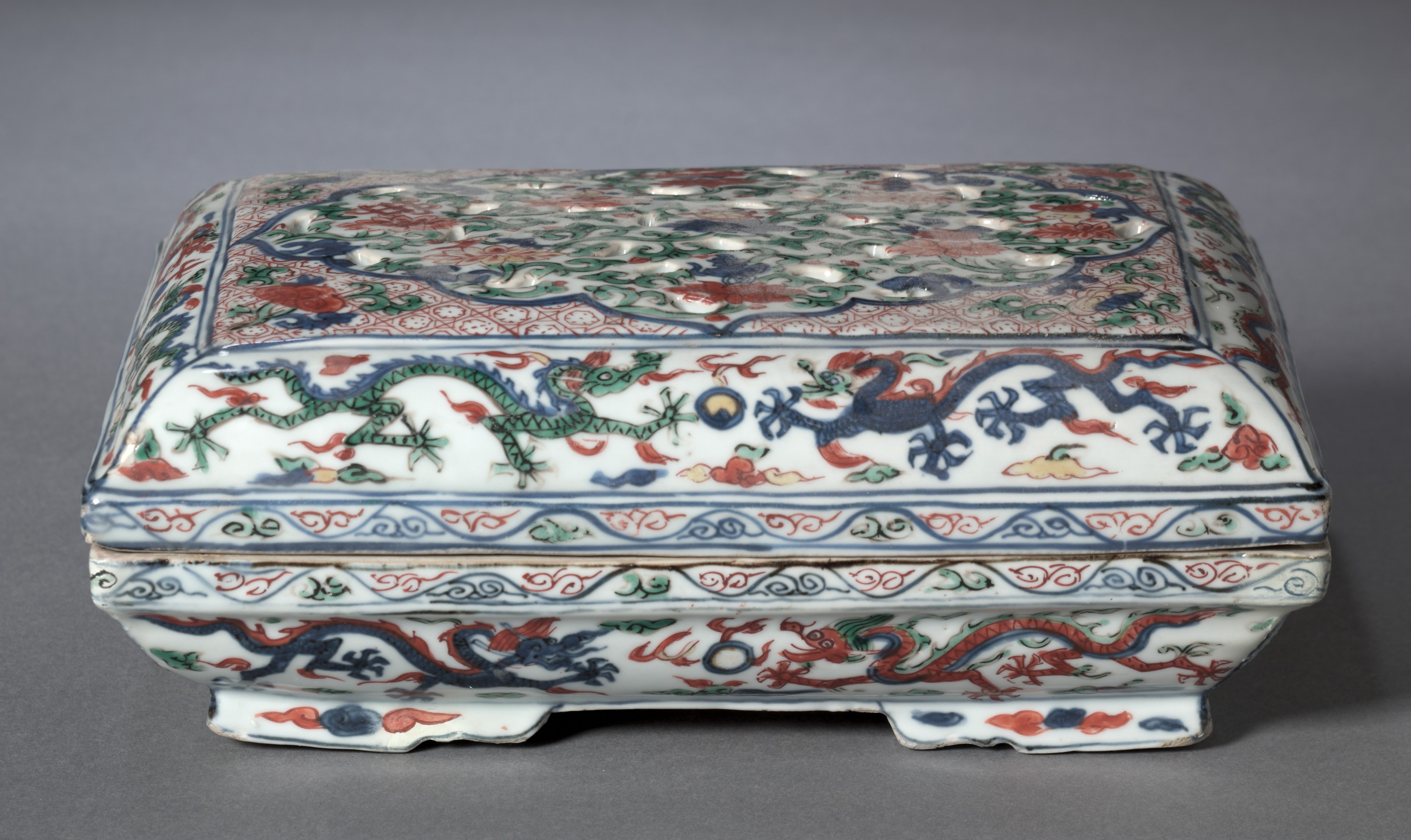 The Box with Cover is white with a raised, rectangular lid. The lid and sides are decorated with a colorful dragon design. The dragons are green, blue and red, with five claws. The dragons have a flame-like pattern around their bodies and appear to be surrounded by clouds. There are three horizontal bands around the box. The top and bottom bands feature scrollwork. The box sits on three feet. The background of the image is gray.