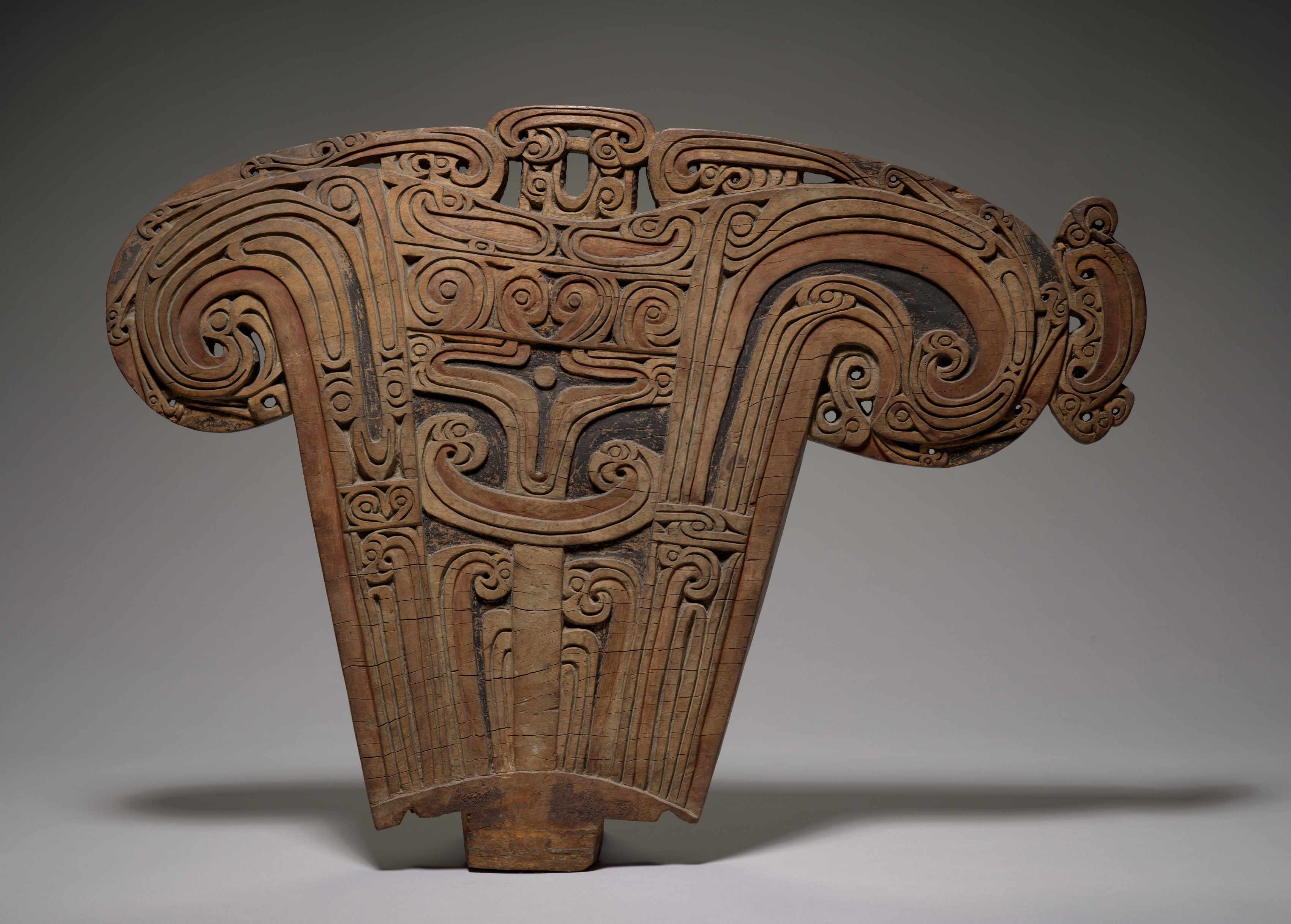 Large, wooden, canoe splashboard by an unidentified Maori artist. The piece has a wide, flat top with two protruding sections on either side. The top section features intricate carvings of curved lines, spirals, and geometric shapes. The center of the piece has a symmetrical design with vertical lines and curved motifs. The background of the image is a gradient gray, transitioning from dark at the top to light at the bottom. The object casts a shadow on the surface below it. The overall shape resembles a shield or a decorative panel.