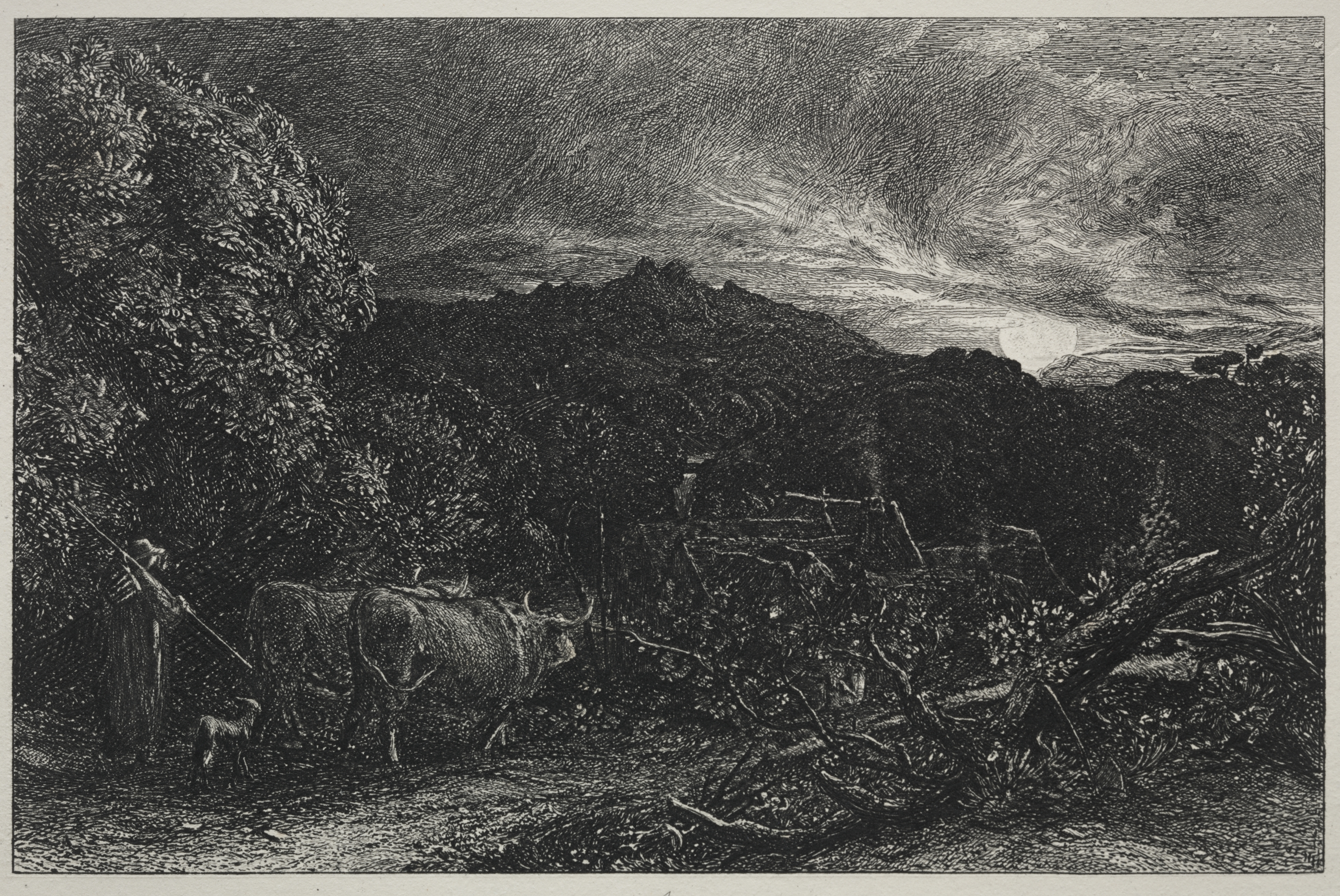 The Weary Plowman by Samuel Palmer: A black-and-white image of a rural landscape with a plowman and oxen. The man stands on the left, leaning on a long stick, beside a large ox; a smaller animal, possibly a dog or calf, stands to the left. The oxen face right; the man looks right. The ground is uneven and rocky. A large tree trunk lies on the ground on the right. Trees and bushes are on the left and in the background. A building is in the background, on the right. The sky is cloudy and dark. The image is a landscape in a rectangular shape with a thin border around it. The style is detailed and textured, with many lines.