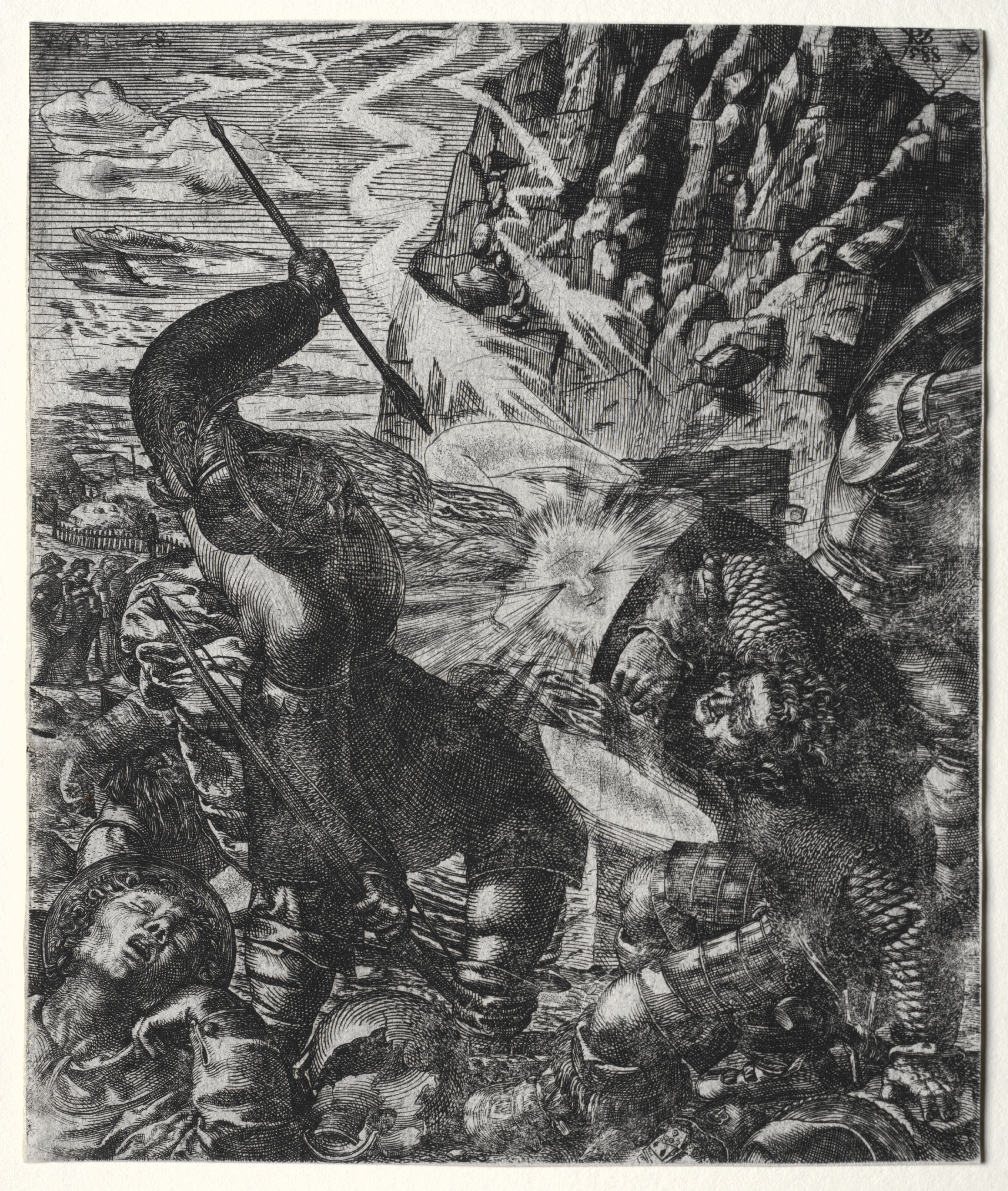Black and white image of a man emerging from a tomb. Two Roman soldiers are on either side of the tomb. One soldier is falling backwards with his sword raised. The other soldier is on one knee and covering his eyes. A burst of light radiates behind the man in the tomb. A mountainous landscape is in the background.