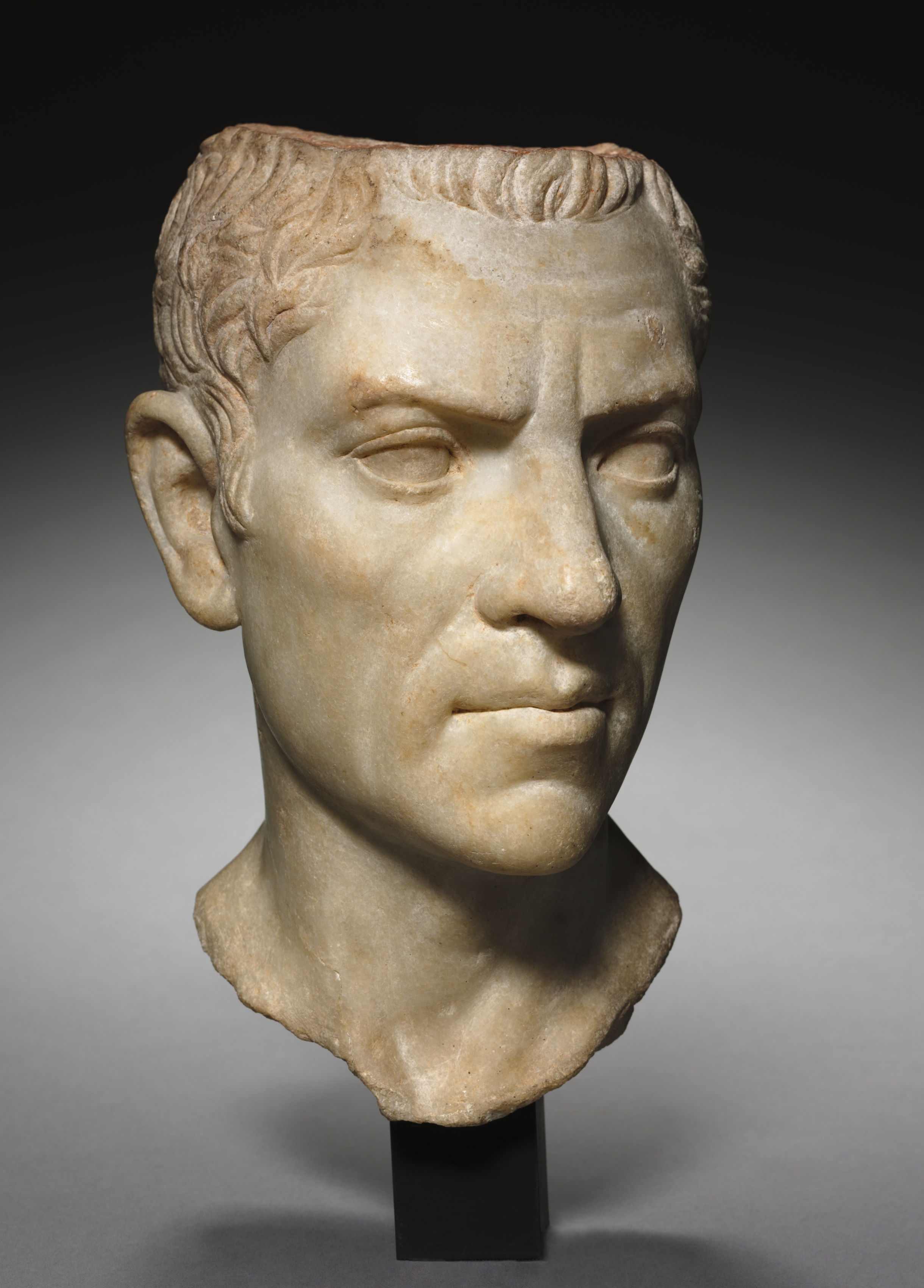 Beige marble bust of a man's head on a black stand. The man has short hair with curled bangs. The hair on the sides and back of the head is not fully rendered. He has a prominent ear on each side of his head. The face has a long nose and thin lips. The neck is partially missing on the left and right sides, with a jagged edge. The background is dark at the top and light gray at the bottom, with a slight shadow cast by the bust on the surface below.