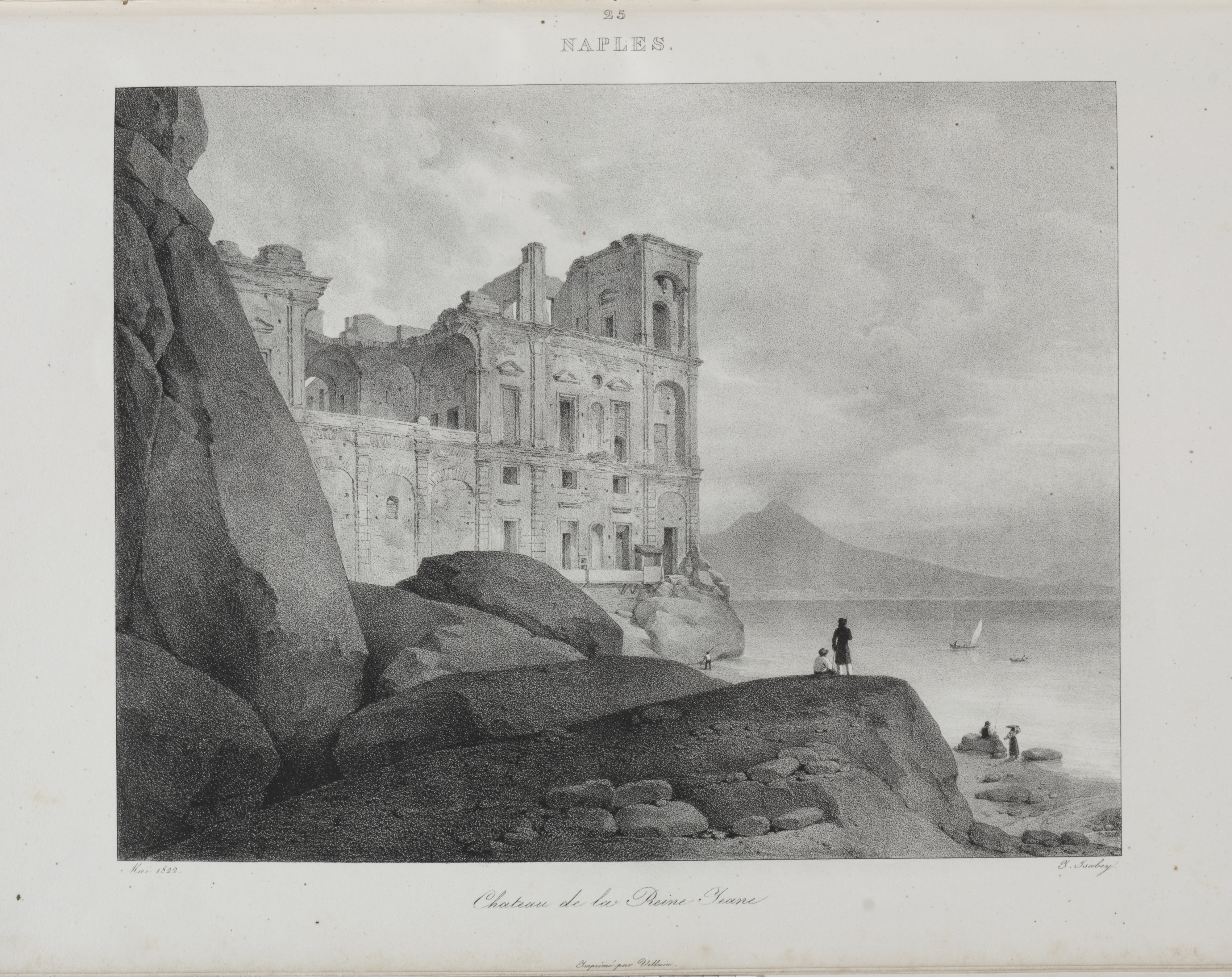 Black and white landscape drawing of a dilapidated building on top of rock formation on the shore. A large boulder on left in foreground. Several people sitting on rocks on right. Sea to right with boats. Mountain distant on right. Cloudy sky. Text at top reads '25 NAPLES'. Text below drawing reads 'Chateau de la Reine Jeanne'.