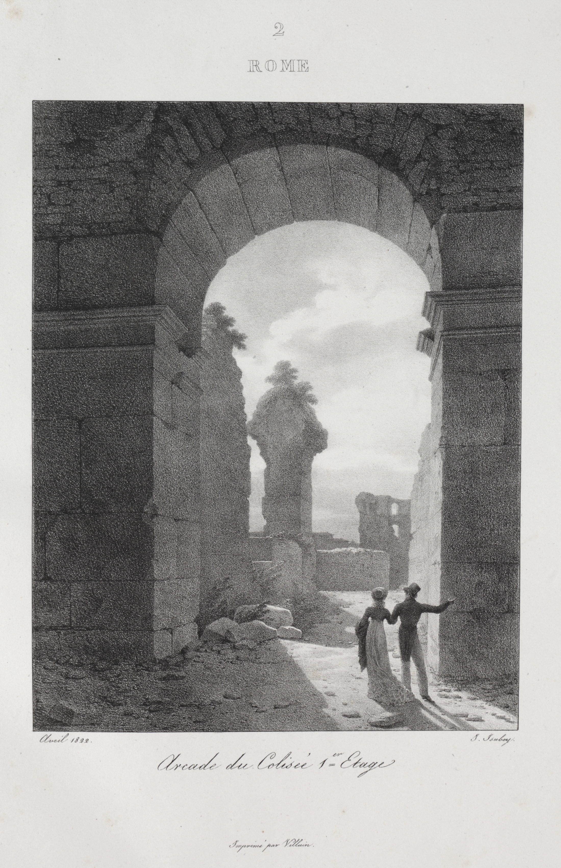Black and white illustration of a stone archway with two people standing near the bottom-right corner; an ancient stone structure visible through the arch; more ruins visible in the distance; cloudy sky; small text at top centre reads "2 Rome"; small text at bottom reads "Arcades du Colisée 1-ère Étape".