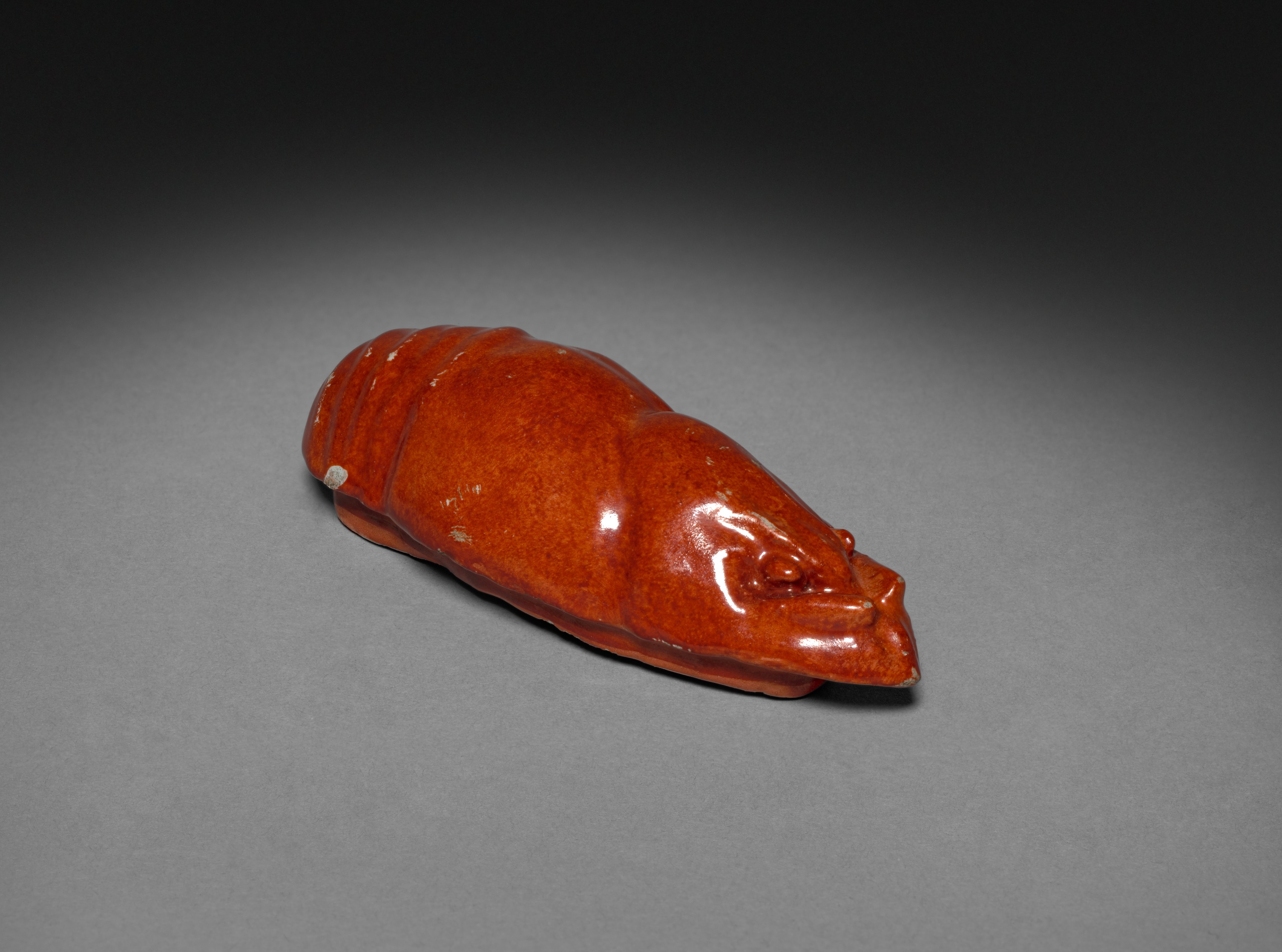 The image shows a shiny, reddish-brown ceramic object shaped like a crayfish. The object is lying on its side, with the head end pointing to the right. It has a glossy finish and appears to be made of ceramic or porcelain. The object is mostly a uniform reddish-brown color, with some darker brown lines running along its body. There are some small white spots on the surface. The background is a plain gray color, with a darker gray vignette effect around the edges. The object appears to be a lid, likely for a plate, given the title.