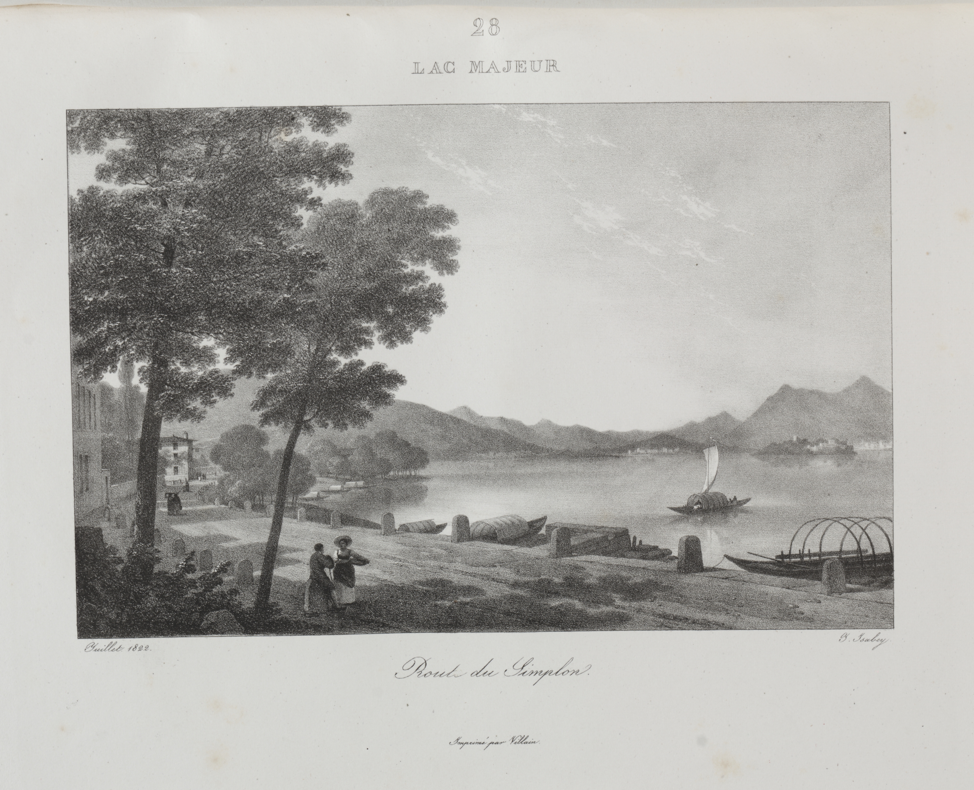 Black and white landscape drawing. A lake with a boat with white sails on it. A boat on the shore in the foreground. A town on the left. A mountain range across the lake. Two trees on the left. Two people and a dog on the shore. The sky with clouds. The text "LAC MAJEUR" at the top. The number "26" above it. Cursive writing at the bottom.