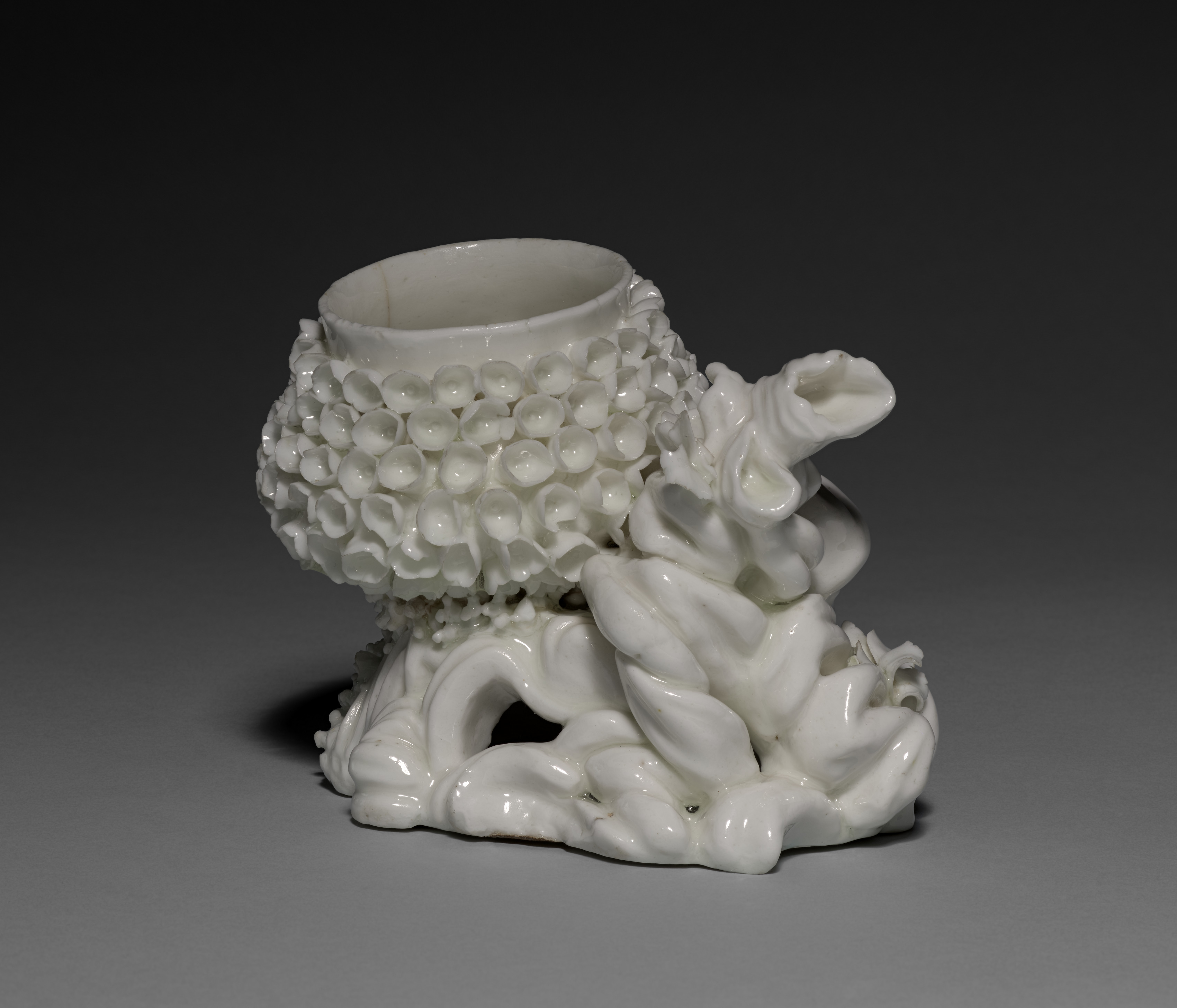 White porcelain vase with a bulbous body covered in small bumps. The base features a branch-like design with leaves. A curved, shell-like handle extends from the body. The vase has a glossy finish. It is set against a dark background.