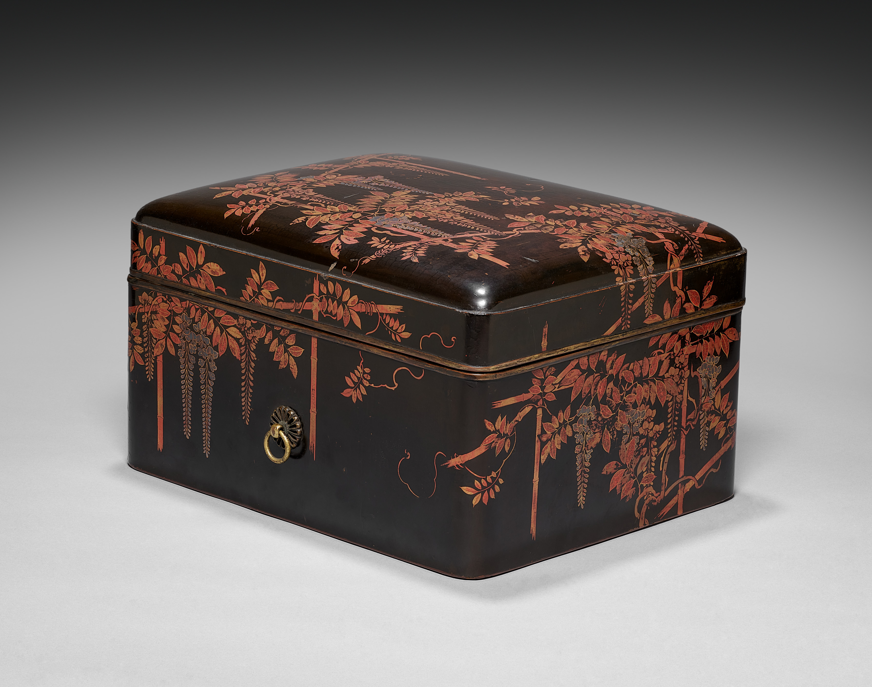 Black rectangular box with rounded corners and a flat lid; gold hinge along the edge of lid; red and gold floral design; small gold ring pull on front. Cosmetic Box with Lid by artist.