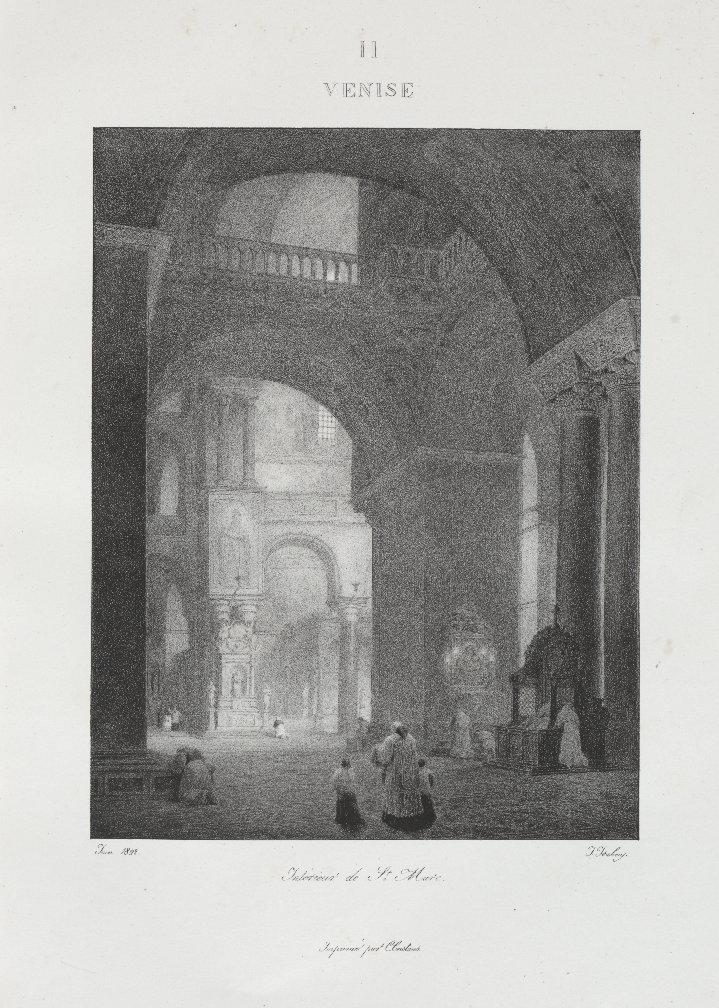 Black and white illustration of an interior scene. The scene depicts a large room with a high ceiling and arches. The room has a balcony with a railing on the top. There are several people in the room. The people are wearing long clothes. There are columns and statues in the room. There is a large archway in the background. The archway has a sculpture in it. The walls are made of stone or brick. The floor is made of stone or tile. The image is labeled "VENISE" at the top and has a number "11" above it. The image has French writing at the bottom. The image is in a rectangular format with a white border. The image is a grayscale illustration.