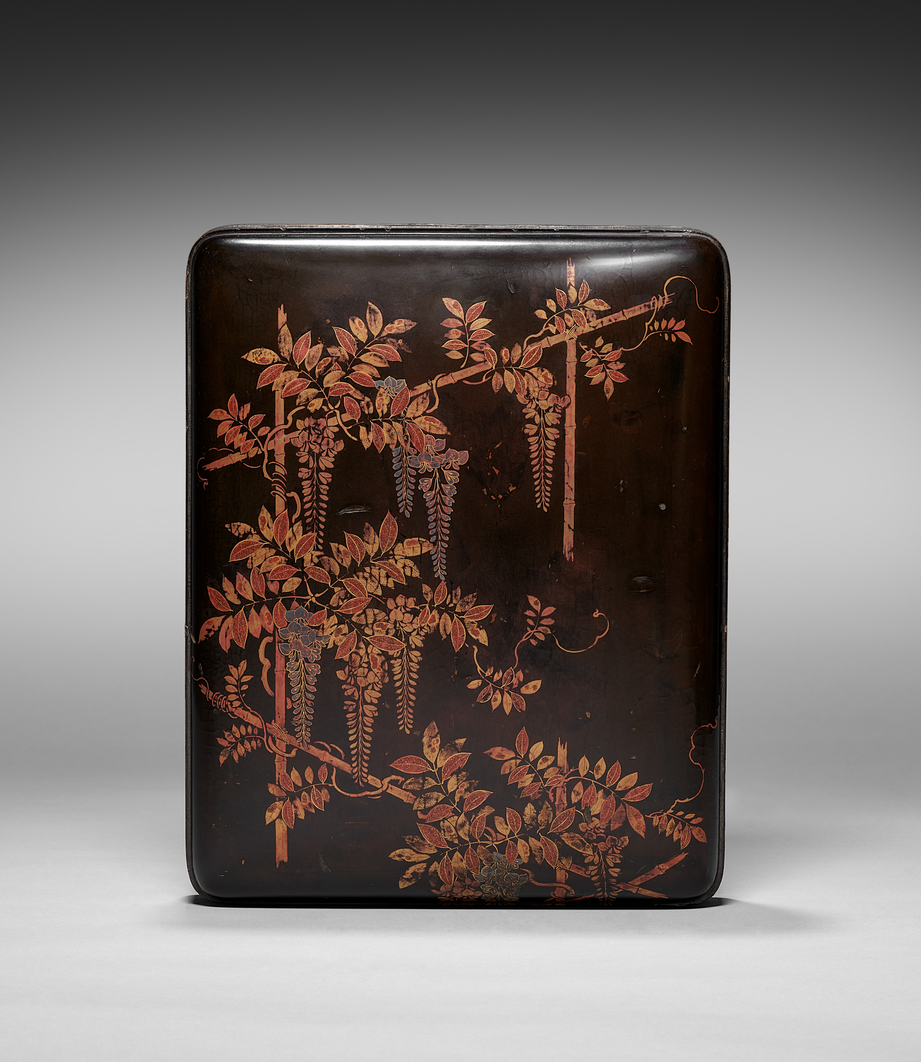 Rectangular dark brown cosmetic box lid with rounded corners and a small hole. The lid features a design of wisteria branches with leaves and flowers in shades of orange, red, and yellow. The background is a gradient that transitions from dark gray at the top to light gray at the bottom. The box lid sits on a light gray surface, casting a shadow. The artist and title of the piece is "Cosmetic Box (lid)".