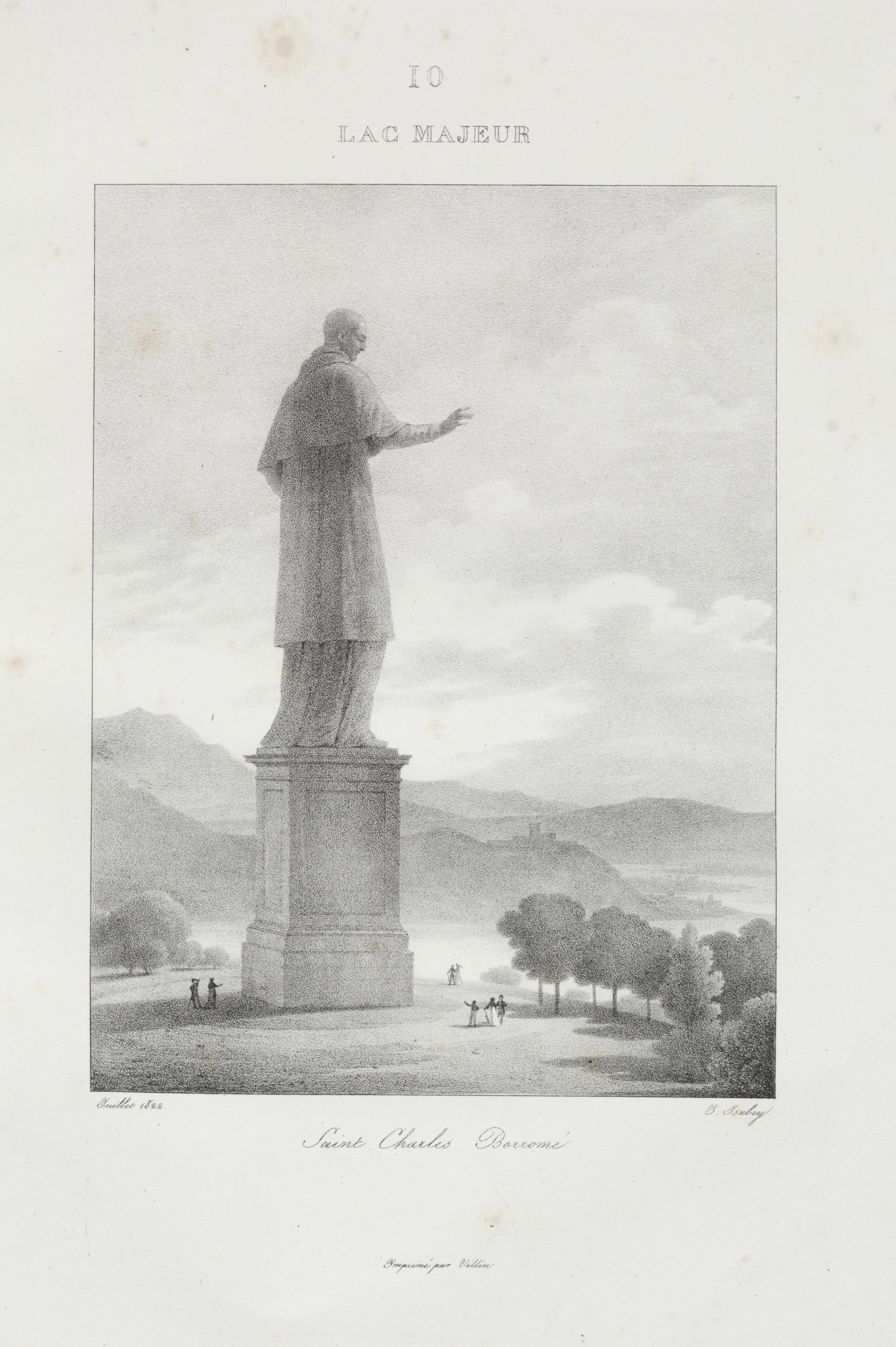 Black and white illustration of a statue of man on a pedestal. The man is wearing a long robe and cloak, with his right arm extended outward and his left arm at his side. He has short hair and is facing away from the viewer, looking toward the right. The pedestal is rectangular and has a flat top. In the background, there are trees, mountains, and a body of water. The sky is cloudy. At the top of the image, the number "10" and the words "LAC MAJEUR" are printed. At the bottom of the image, there is a signature that reads "Saint Charles Borrome" and another illegible signature.