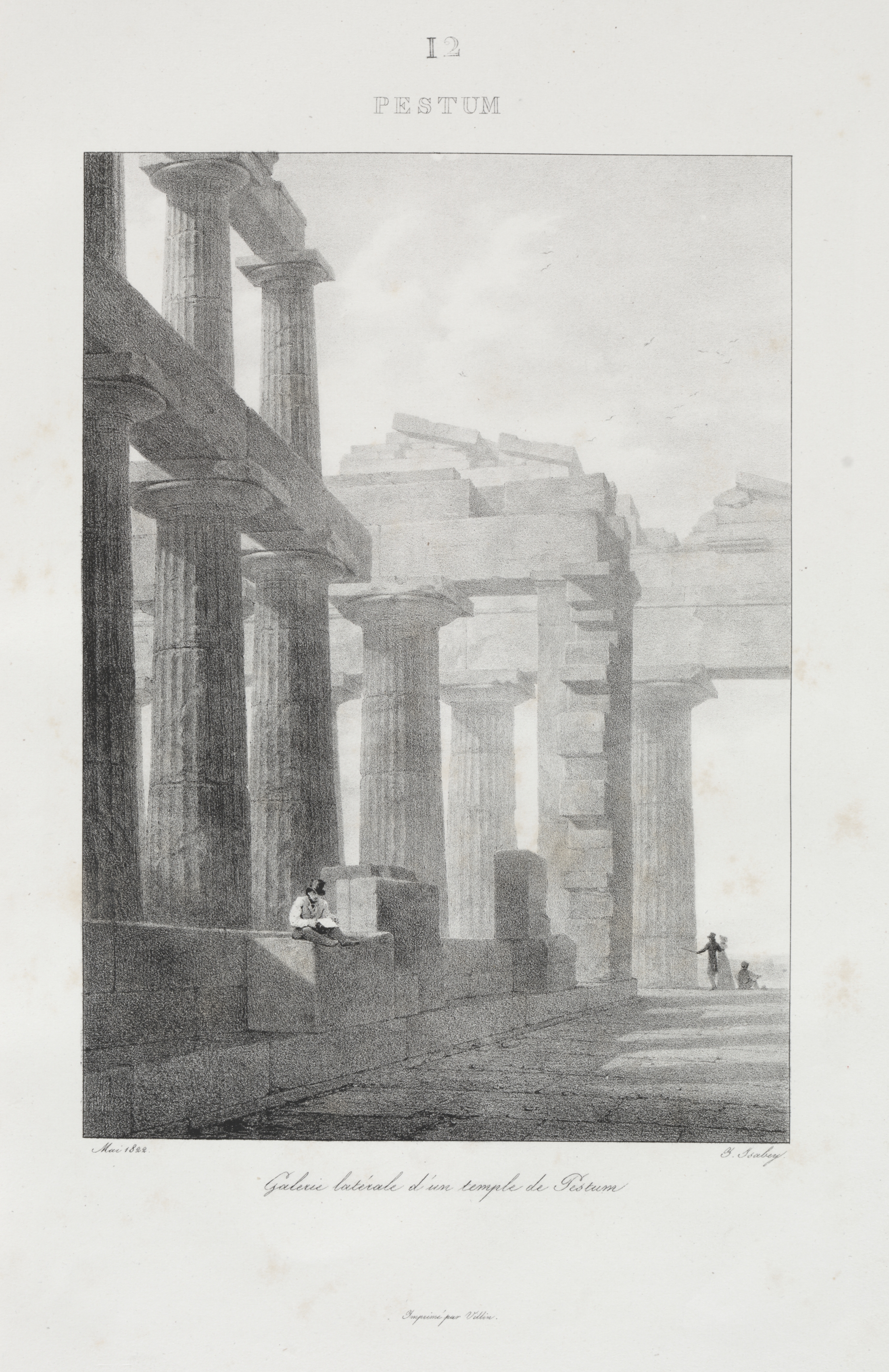 Black and white illustration of ancient stone structure with columns. The illustration is in a rectangular frame. The structure has multiple columns in the foreground and background. The columns are thick and have decorative tops. Some columns are standing alone, while others are connected to form arches. The structure appears to be in a state of ruin, with some columns lying on the ground. There are people in the scene: one sitting on a low wall in the lower-left, and two in the distance on the lower-right. The sky is cloudy. The image has a title at the top that reads "12 PESTUM". There is writing at the bottom of the image. The image is set against a white background.