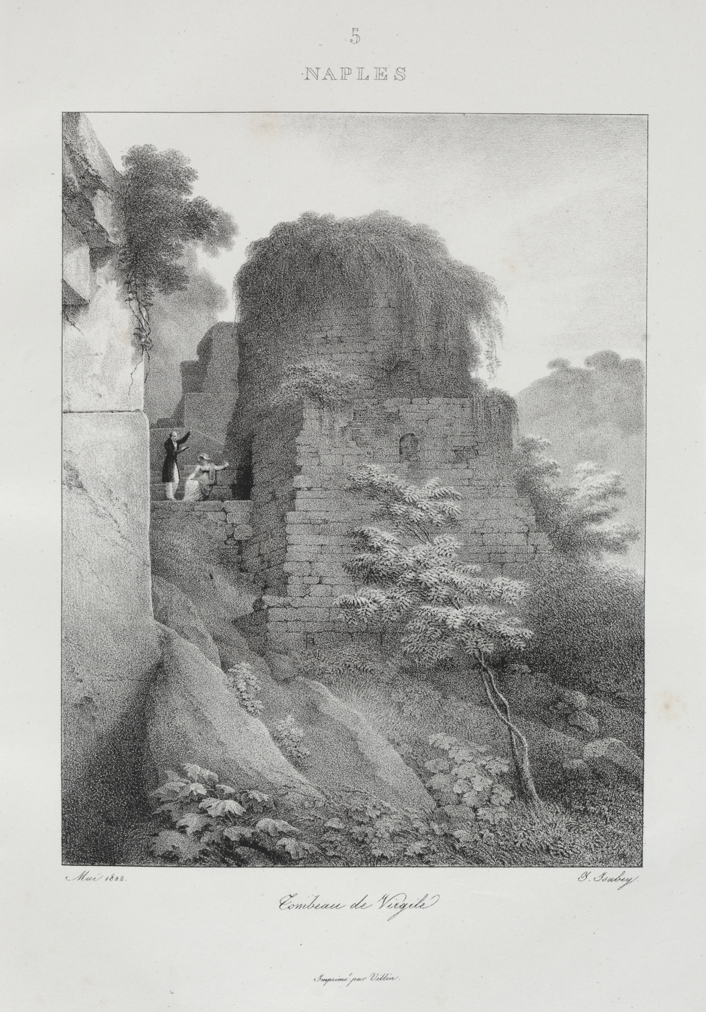 Black and white landscape drawing of ruins. A large stone structure with a rounded top sits on a hill. Trees grow on top of and around the ruins. Two people sit on a wall to the left. A tree grows from the left side of the frame. Small trees dot the right side. A caption reads "Naples" above. A signature is visible in the bottom right corner of the drawing. The drawing is centered on the page. A title written in cursive is at the bottom center. Text is at the bottom left and center. A number and centered text are at the top.