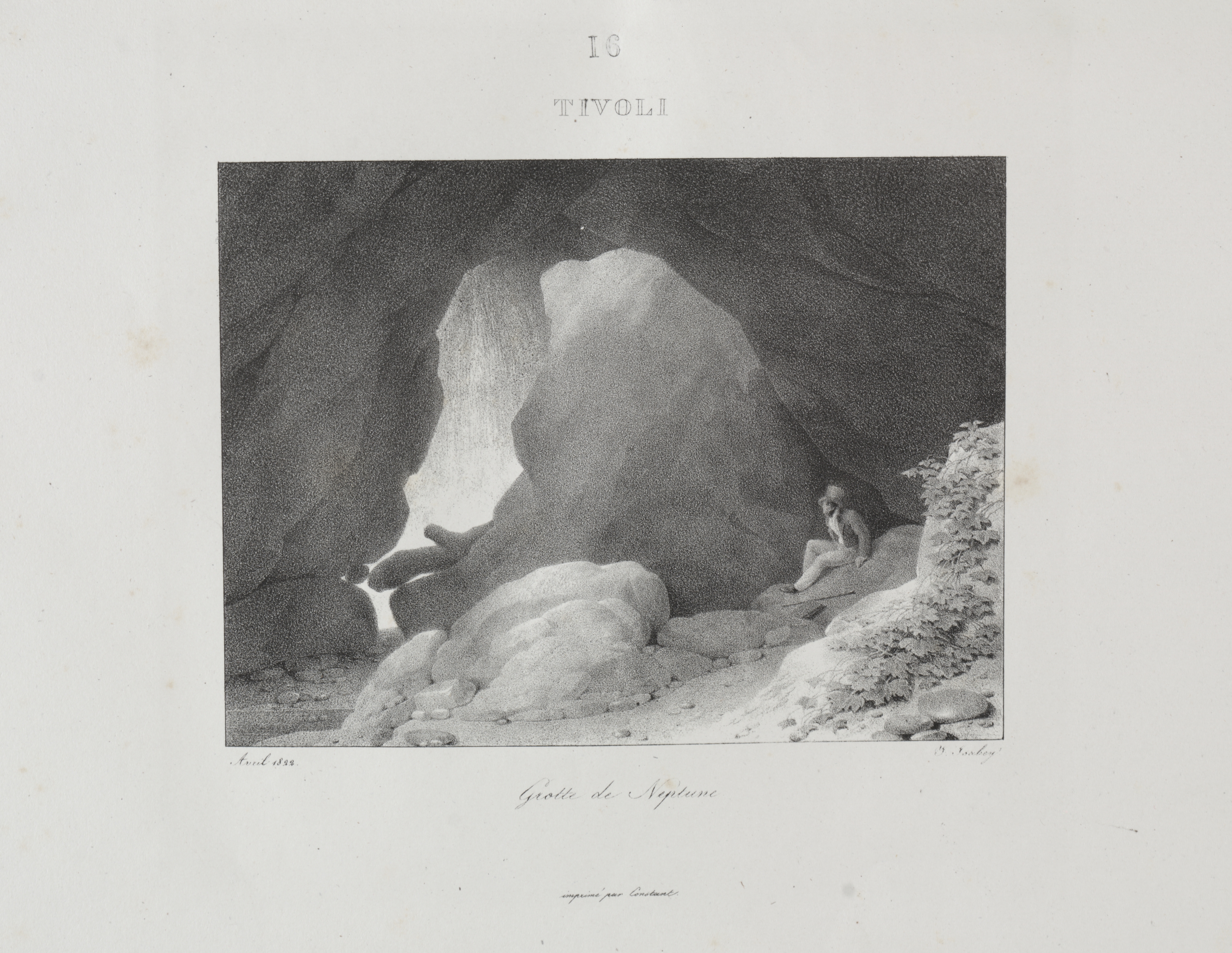 Black and white landscape illustration of a cave. The cave entrance is formed by two large rocks. A man sits on a rock to the right, and the opening behind him leads to bright white sky. Rocks and boulders are scattered throughout the foreground. A patch of greenery on the right. Number 16 and the word Tivoli are at the top. Writing in cursive at the bottom reads "Grotte de Neptune".