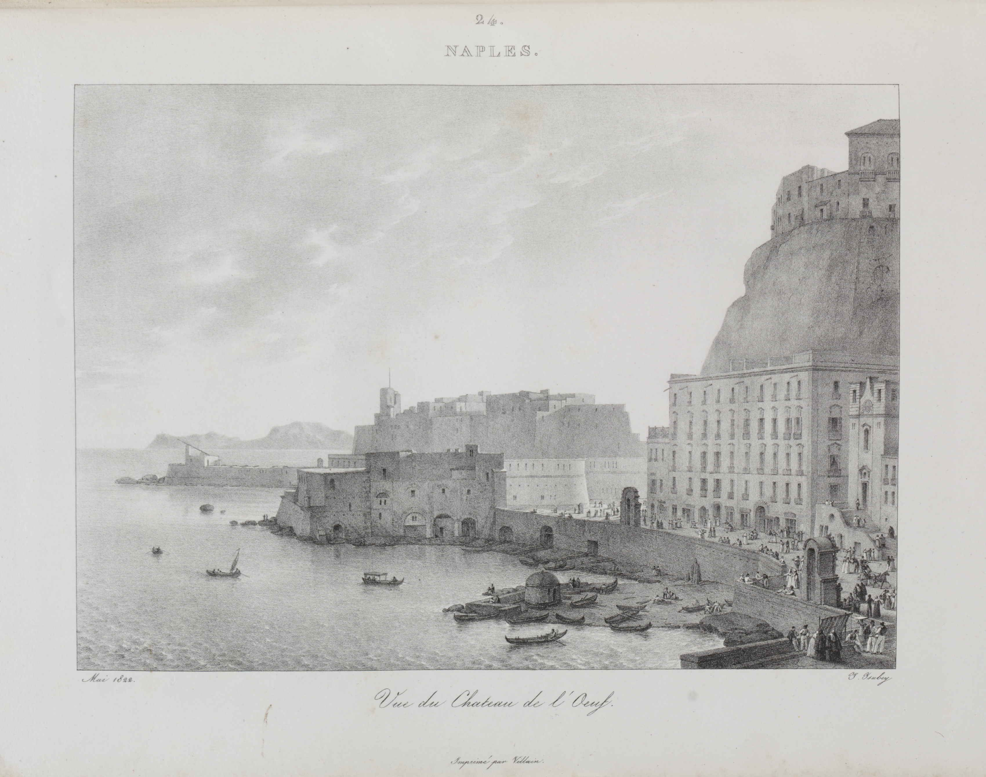 Black and white image. Beige border around image. Top center of border reads "2 /e. NAPLES." Center image shows a body of water. Boats are in the body of water. A long stone wall borders the water on the right. Buildings are on top of the wall and on the right. The building on the right has five stories. People stand on a sidewalk in front of the building. Large hill on the right. Fortress type building on the left. Distant mountains are in the background. The sky is cloudy. Handwritten cursive text is at bottom. Small printed text is at bottom center.