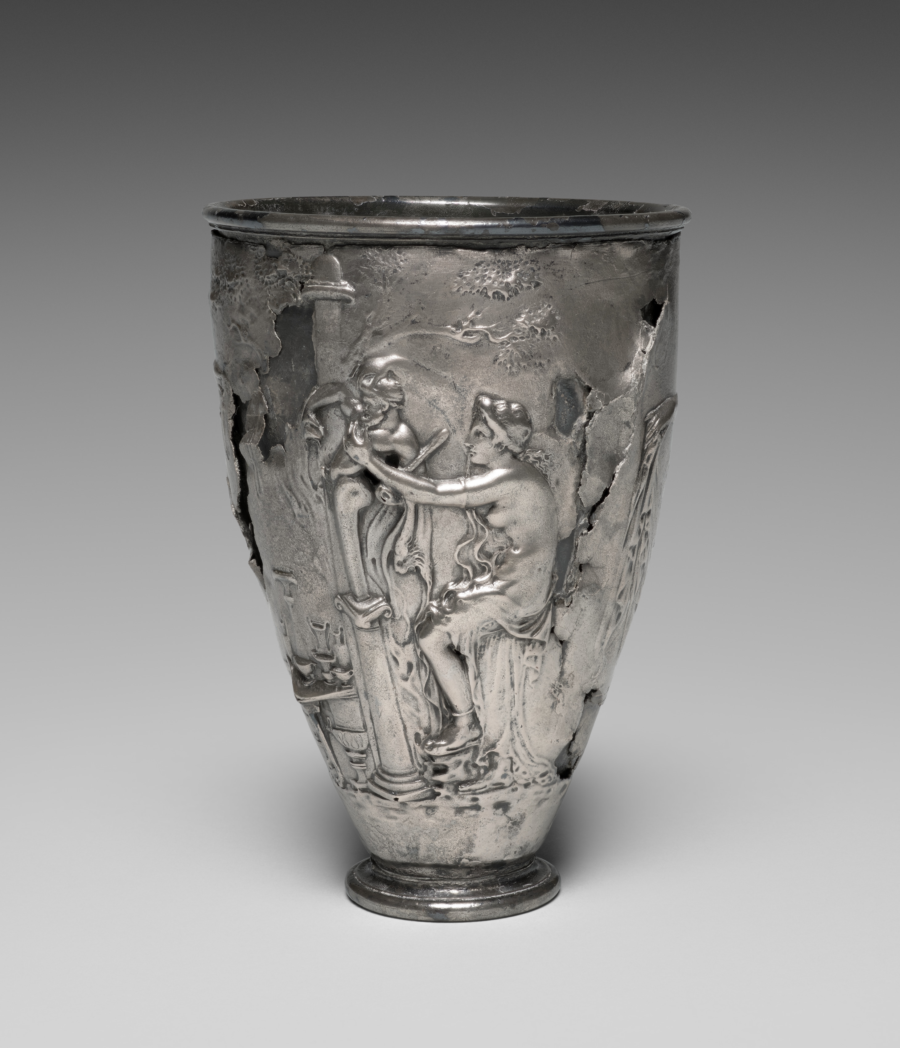 The Vicarello Goblet by Italian artist is a silver cup. The cup is tall and tapers outward from a short base to a wide mouth. The body of the cup features a relief sculpture depicting two nude women standing on either side of an obelisk. The standing woman on the left side of the cup holds a bow in her right hand and an arrow in her left hand. The woman on the right side holds an arrow in her right hand and appears to be reaching for the quiver of arrows on her back with her left hand. The cup appears to have damage around the rim and body, with a dark patina and areas of wear visible. The background of the image is a gray gradient.