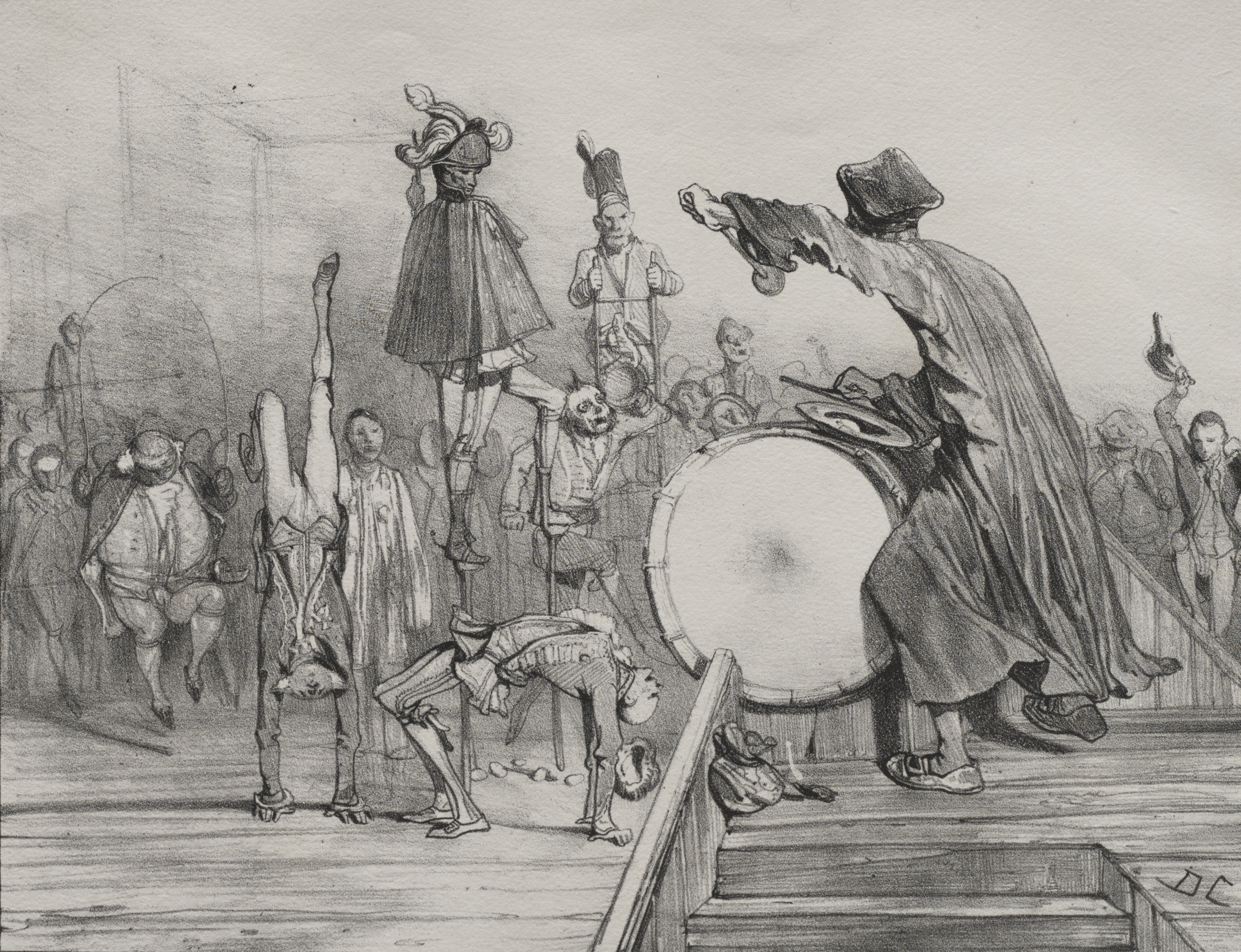 Black and white drawing of a man playing a drum on a stage. The man playing the drum faces to the left; he wears a hat and long coat and has his right arm raised in the air. The drum is large. Three acrobats dressed in dark clothing and feathered hats are on stilts; one is upside down. A crowd surrounds the stage.