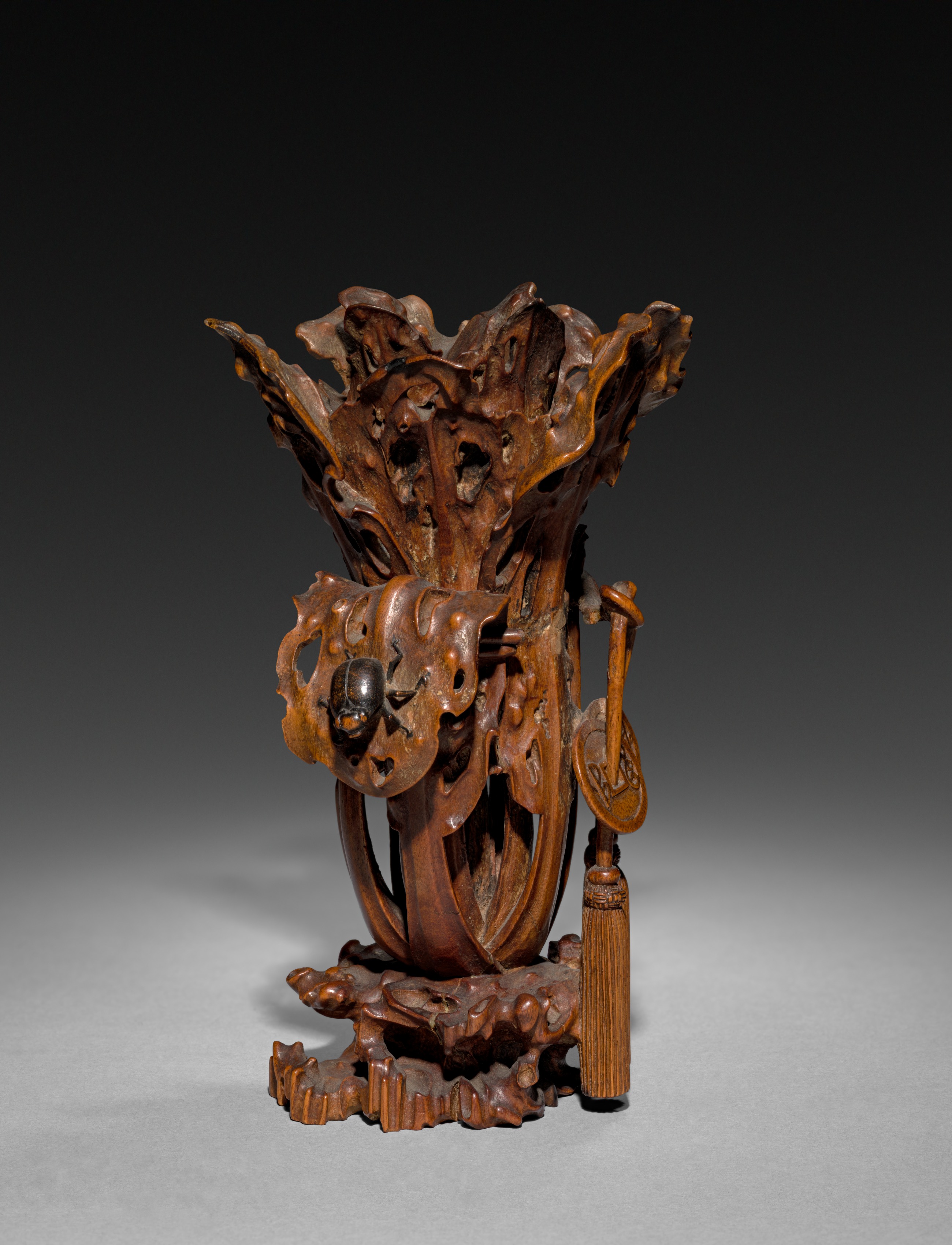 The sculpture "Cabbage and Beetle" by unknown artist depicts a brown, intricately carved wooden object. The object features a large, hollowed-out cabbage with a beetle resting on one of its leaves. The cabbage has a wide, flared top with wavy edges resembling leaves. The base of the cabbage is supported by a curved stem that connects to a flat base. A small tassel hangs from a handle on the right side of the base. The beetle on the left side appears shiny and black. The background is dark gray to black, with a light gray surface.