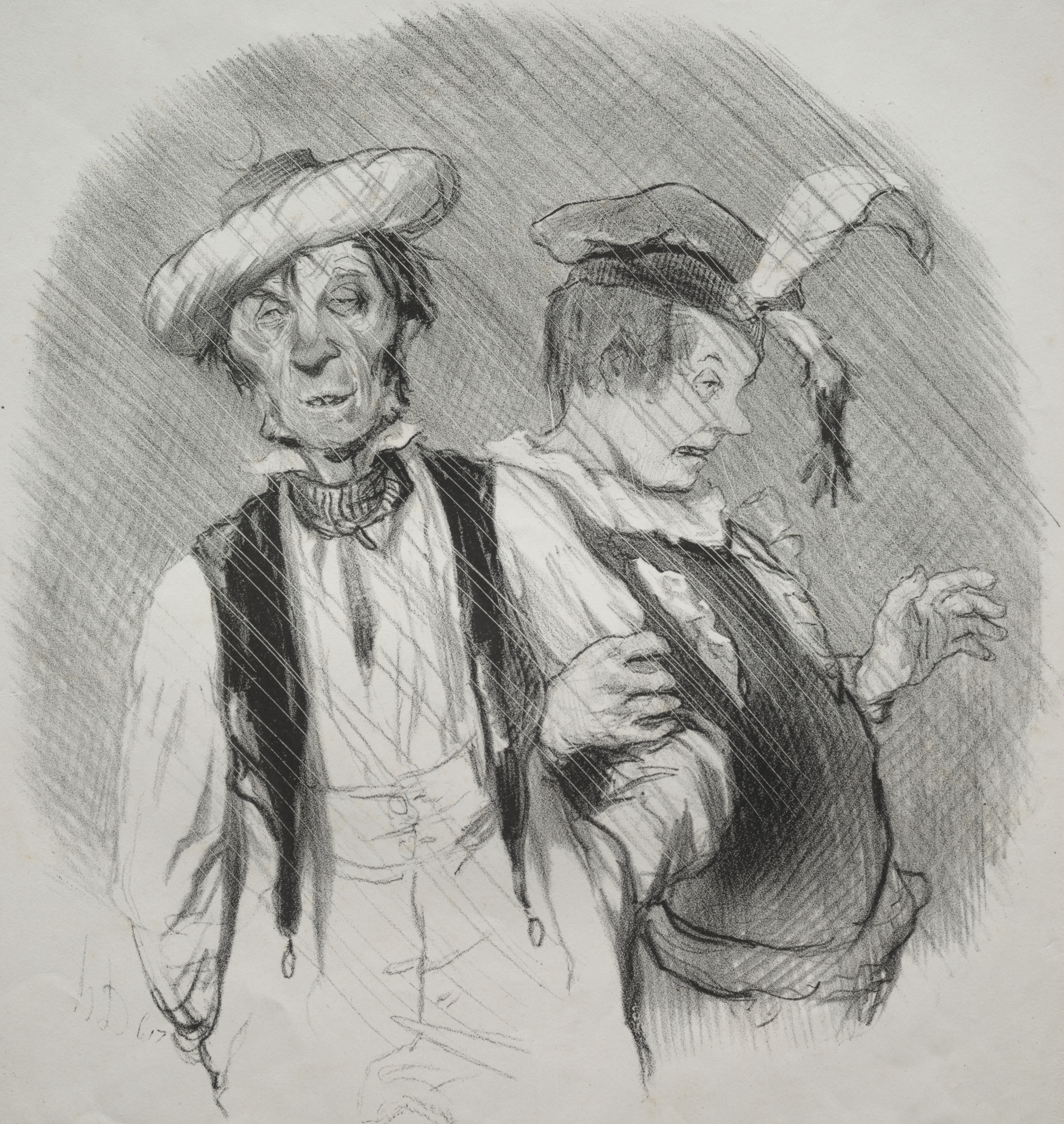 Black and white sketch of two men. The man on the left has a large hat with a short brim, is wearing a white shirt with billowly sleeves, a high collar, and a black vest. The man on the right is wearing a hat with a long feather tucked into the band, and a vest over a white shirt with ruffles at the neck. The man on the right has his left arm raised and hand open. The man on the left has his right hand on the other's left arm. The background is shaded with diagonal lines. The men are dressed in 19th-century attire.